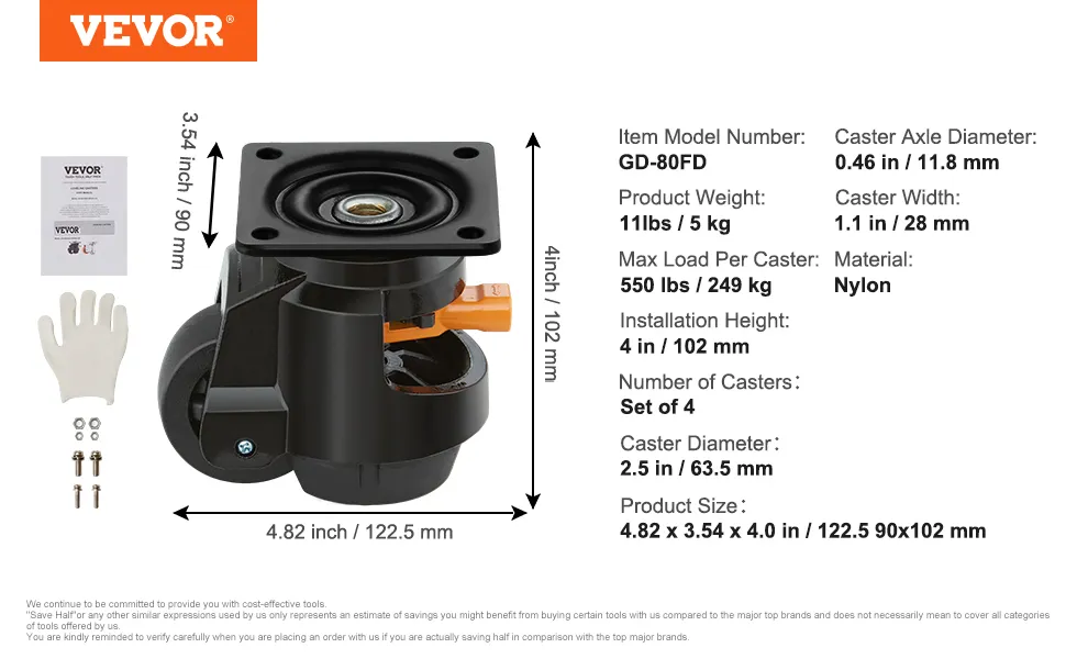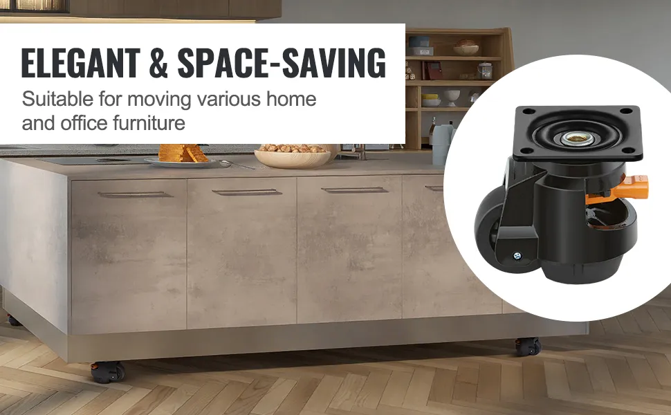 The design of these VEVOR leveling casters prioritizes stability and mobility. Each caster has a foot that lowers to the ground for a solid base. This design is perfect for uneven floors. The easy-twist handle allows you to adjust the height easily. Strong construction ensures the casters hold steady under load. You can move your heavy equipment smoothly and effortlessly. Once in place, the leveling feature keeps everything stable. It is ideal for a workbench, tool chest, and other heavy-duty applications. Enjoy the combination of stability and mobility that these movers offer.