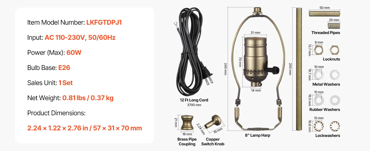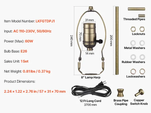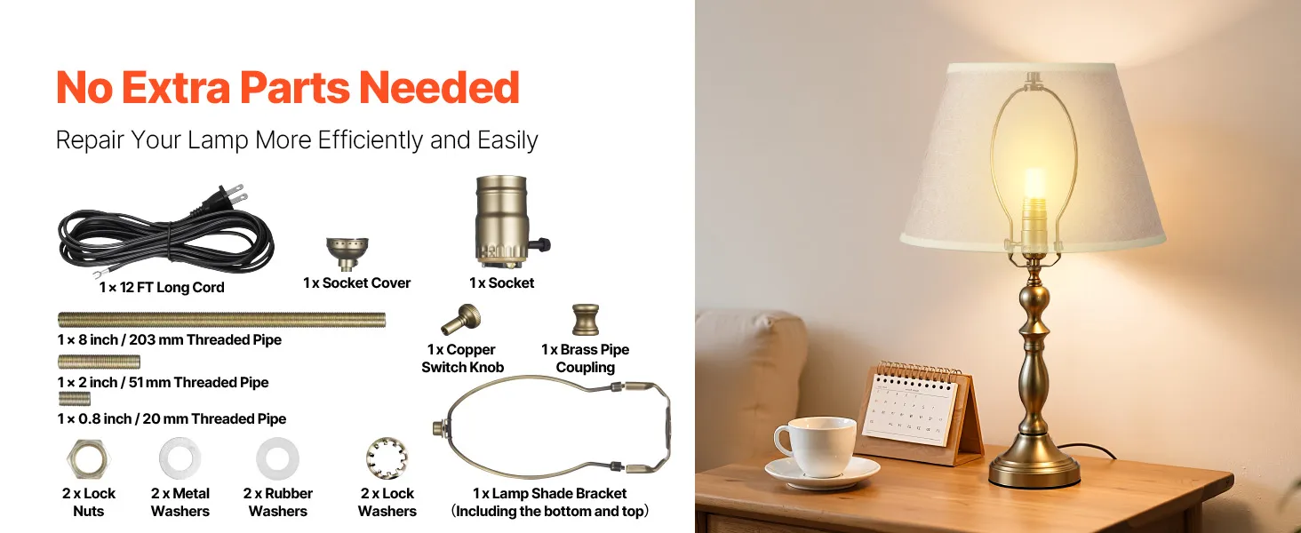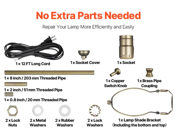 Complete Lamp Socket Kit: Our lamp repair kit includes a switch knob, 12 ft power cord, lampshade bracket, socket, socket cover, threaded pipe, and washers. Everything you need for quick replacement or repair, making your lighting fixture look new