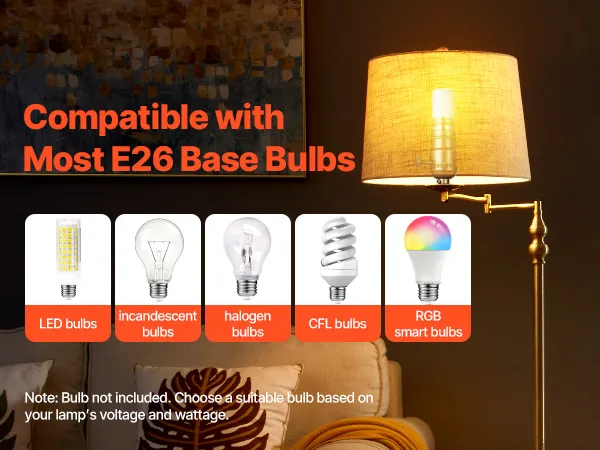 Rotary Adjustment: This lamp kit features a 3-level rotary switch to adjust low, medium, and high brightness. It also supports E26 bulbs up to 60W (AC110-230V), including LED, incandescent, halogen, CFL, ceiling, and RGB smart bulbs