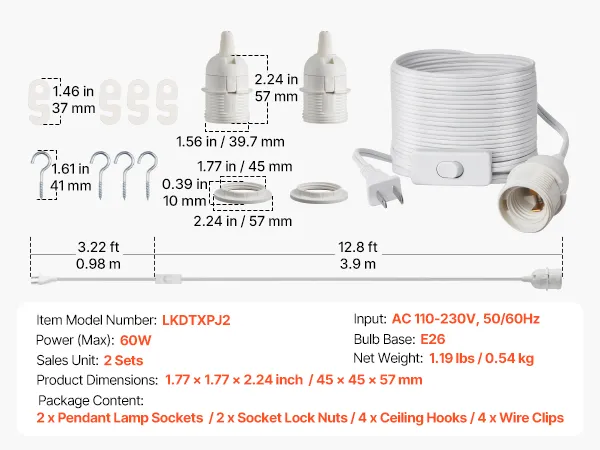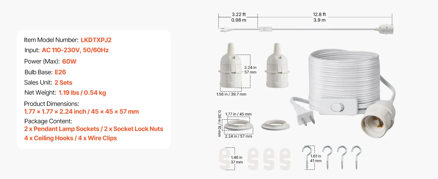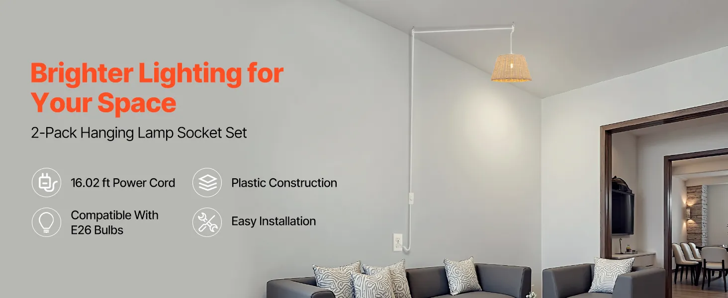 Each hanging light cord includes a 16.08 ft extra-long power cord for flexible layout options. Made of durable plastic with good insulation and wear resistance, it ensures stable long-term use. Compatible with standard E26 bulbs, its simple installation requires no complex tools.