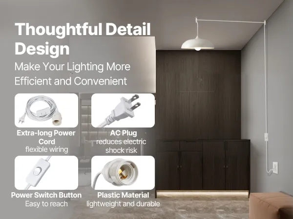 This pendant light cord kit makes lamp usage more efficient. The extended power cord provides flexible wiring, while the secure AC plug reduces electrical risks. The power switch button is easy to reach and the control. Combined with lightweight & durable plastic, it elevates the user experience.