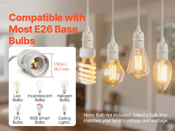 Universal E26 Base: This universal E26 bulb base supports various bulb types, including LED, incandescent, halogen, CFL, ceiling, and RGB smart bulbs. Our plug in pendant light cord supports up to 60W (AC110-230V). Note: Bulb not included