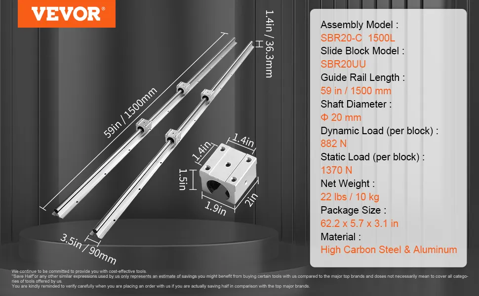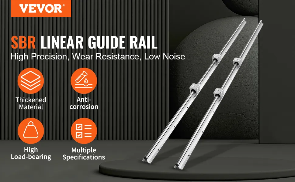 The SBR20 guide rails provide smooth and accurate linear motion. It is ideal for both amateur and professional applications. High carbon steel and aluminum construction provide durability and reliability. The set includes two 59-inch rails and four SBR20UU slide blocks. These components work together to support heavy loads. These components glide smoothly, ensuring precise performance. Whether you're building a sled or a CNC machine, this set meets your needs. These rail sets are perfect for any workshop. The ease of installation and the robust design make them incredibly useful for every project. The strong design of VEVOR makes them an excellent addition to any tool collection. This linear guide rail set offers precise, smooth, and reliable operation. You can use it for anyone seeking accuracy in their work.