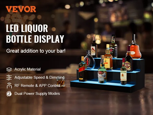 The VEVOR 3-step liquor display shelf is easy to set up. It includes all parts and instructions. You can easily get it ready for use. Easy assembly allows you to take the display down quickly and without any trouble. This shelf is made for both home and commercial use, fitting perfectly in any bar setting, whether it's a home bar or a tavern. The user-friendly design makes it accessible to everyone. Set it up and start enjoying your stylish display right away.
