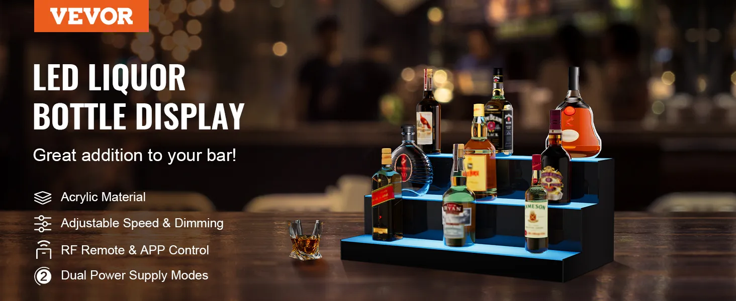 The VEVOR LED lighted liquor bottle display is a game-changer for your bar. This shelf makes your bottles shine with bright, colorful lights. It fits perfectly into any home bar, giving a'modern vibe'. The lights are bright enough to highlight each bottle, adding elegance to your setup. Our shelf is designed to catch the eye and create a stylish display. For those who want to make a unique bar area, this display is perfect because it’s made in upscale ways.