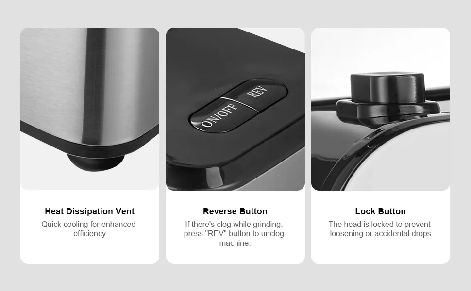 Don't worry about safety; just focus on cooking. The meat grinder and sausage maker were made with your comfort in mind. It features feet that prevent slipping, keeping it steady when in use. There is also overload protection to keep the motor safe. The reverse function allows you to clear any clogs quickly. The controls are straightforward to understand, allowing even beginners to use them effectively. This design is easy to use and makes sure that it works safely every time. Knowing it's easy and works lets you grind with confidence. Cook without worries. Ready to cook excellent cuisine!