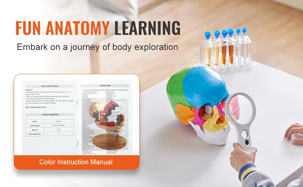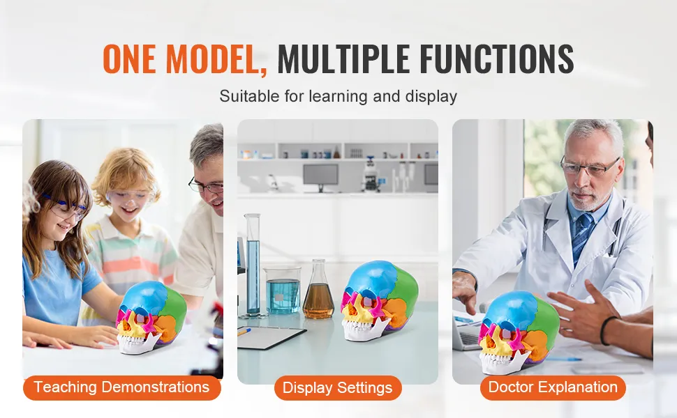 The VEVOR human skull model is life-size, making it realistic and effective. It’s made from durable PVC material. This ensures it lasts a long time and can withstand frequent handling. The model also has some kid-friendly features. The bright colors make it easier to identify different parts. The design is also simple to disassemble and reassemble. As a result, this feature serves as an excellent teaching aid. Perfect for classrooms and homeschool settings. Additionally, the model is perfect for both classroom settings and assembly. Due to its lightweight design, you can easily carry it around your head and use it for many years. It's a wonderful choice for both kids and adults.