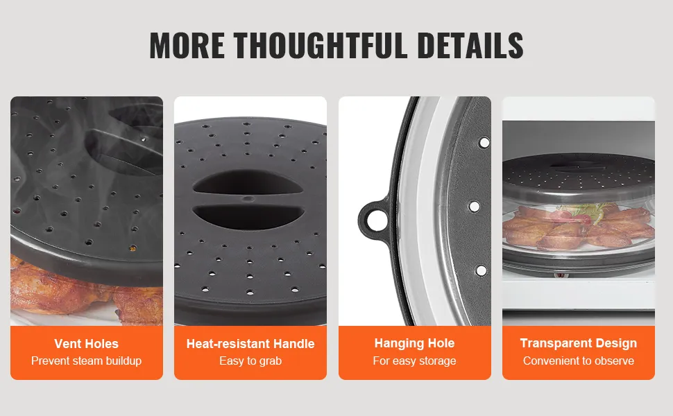 The 10.4-inch diameter is large enough to fit standard-sized dinner plates, bowls, and dishes, completely covering them to prevent splatters and spills. It reheats single and family-sized portions, making it an easy-to-use kitchen device for reheating, defrosting, and cooking.
