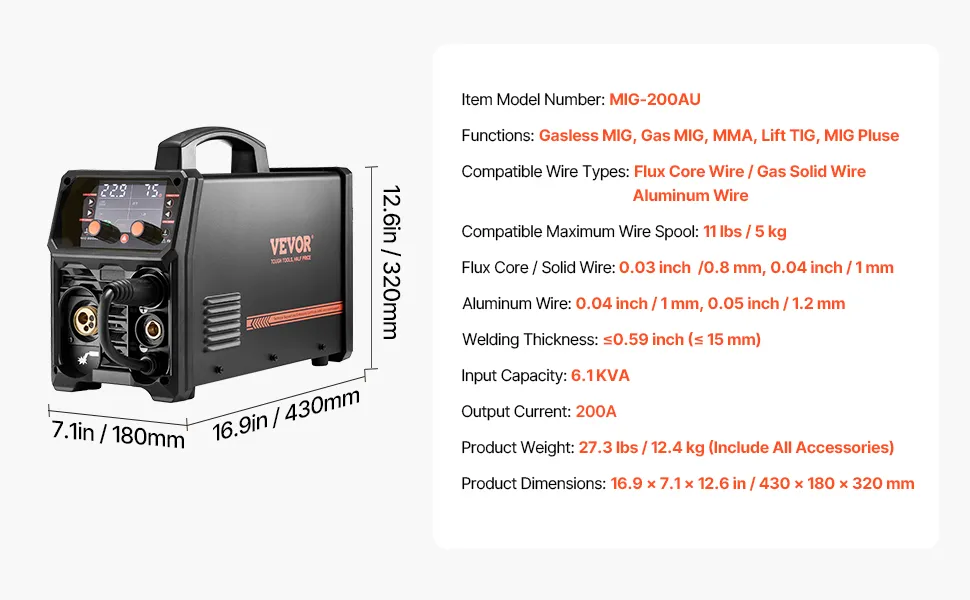 5-in-1 MIG Welder: This 200A 5-in-1 pro mig welder supports various functions - MIG Pluse, gasless MIG, gas MIG, MMA, and Lift TIG. The innovative pulse welding function provides fast, high-quality, low-spatter welds and better thermal control than traditional MIG welders, allowing perfect welds at lower temperatures. (Note: Aluminum welding torch is not included and needs to be purchased separately ; Lift TIG torch not included)