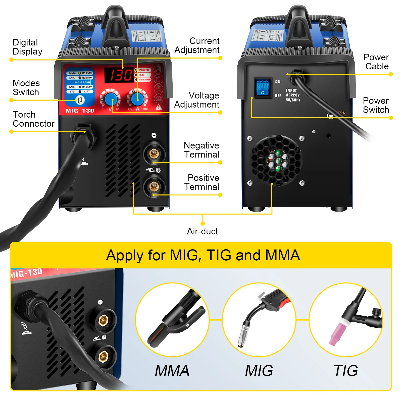 The panel of the welder is straightforward and easier to operate. Three modes can be easily switched: MIG, MMA, TIG. The welding current and voltage are adjustable. You can adjust according to your application and different materials.
