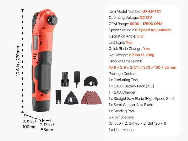 With a 12V operating voltage, 3.2° oscillation angle, and 6 variable speeds ranging from 6000 to 17,500 OPM, this oscillating multi tool delivers strong, consistent performance for efficient work.