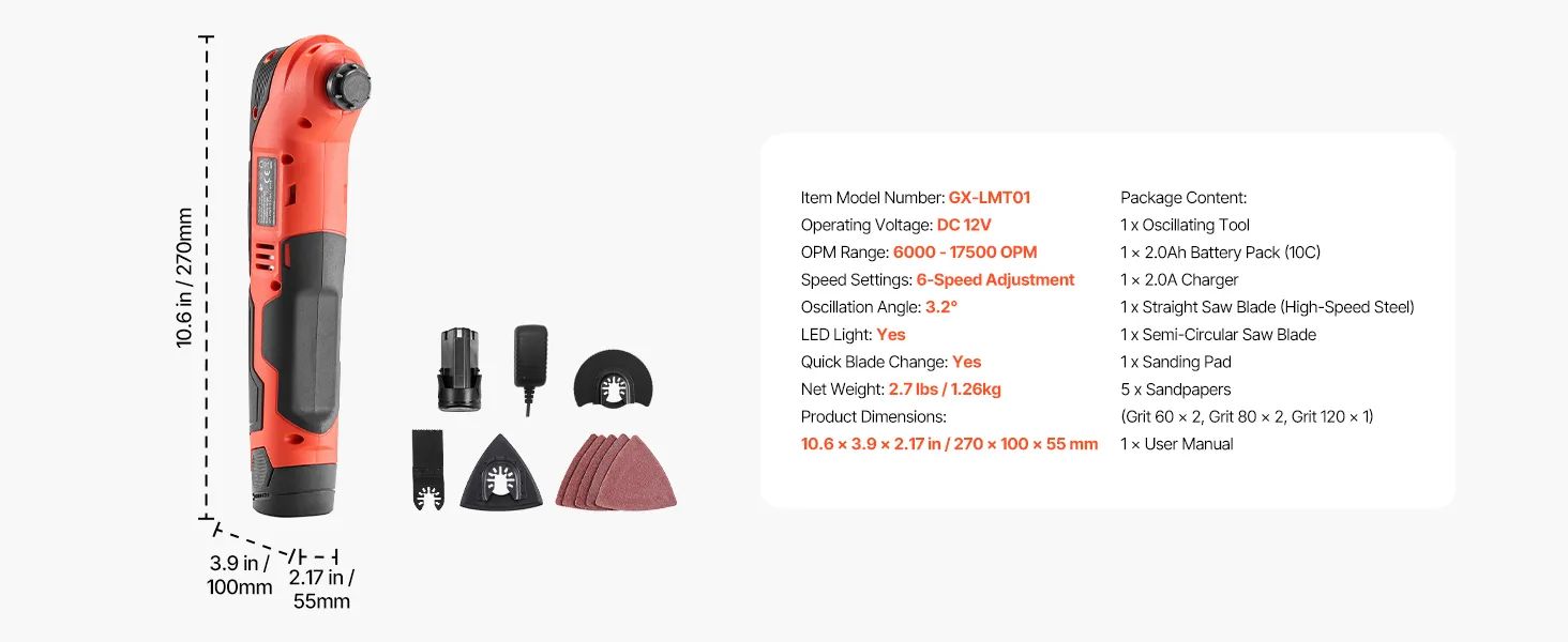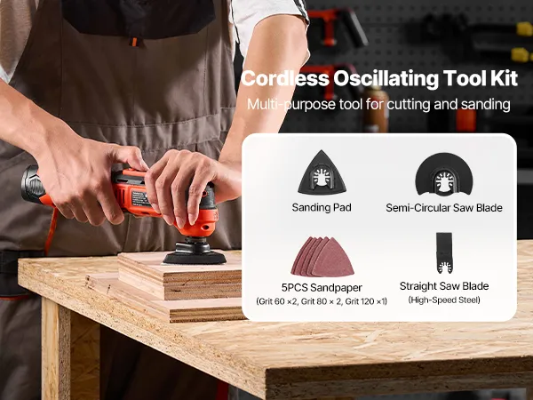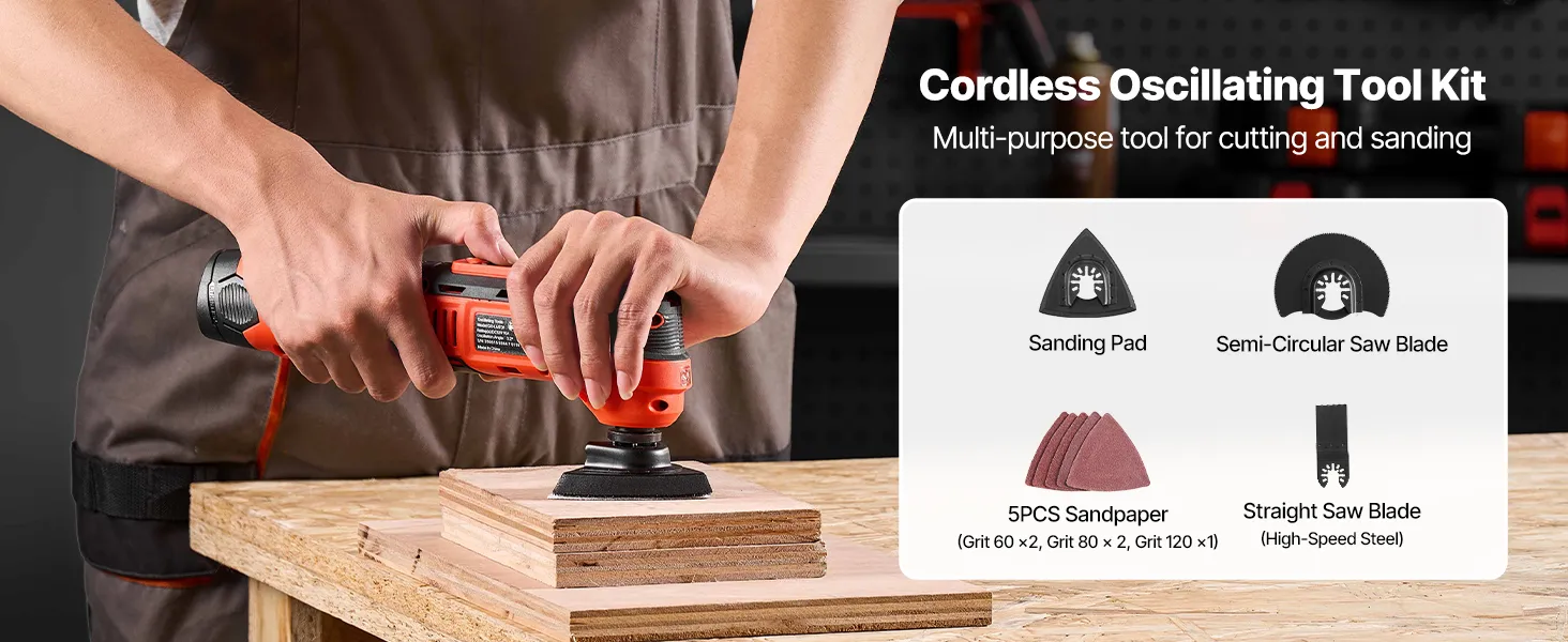 Versatile Multitool Kit: The VEVOR 12V cordless oscillating tool kit includes a high-speed steel straight saw blade, a semi-circular saw blade, a sanding pad, and 5 sandpapers (60/80 Grit *2, 120 Grit * 1). Perfectly ideal for home improvement, woodworking, and DIY projects