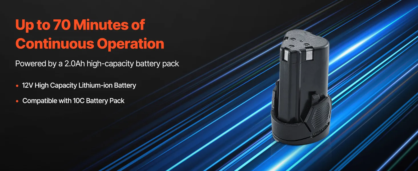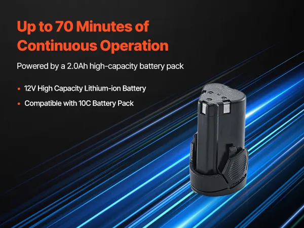 Equipped with a 12V 2.0Ah high-capacity lithium battery and a 2A battery charger, this oscillating tool delivers extended runtime on a full charge. Its cordless design gives you the freedom to work without being limited by power cords.
