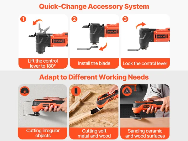 Quick Blade Change: Our oscillating tool has a locking lever, easy to change attachments without needing a wrench. Built-in LED work light illuminates dark spaces, ergonomic handle and lightweight body ensures a comfortable grip