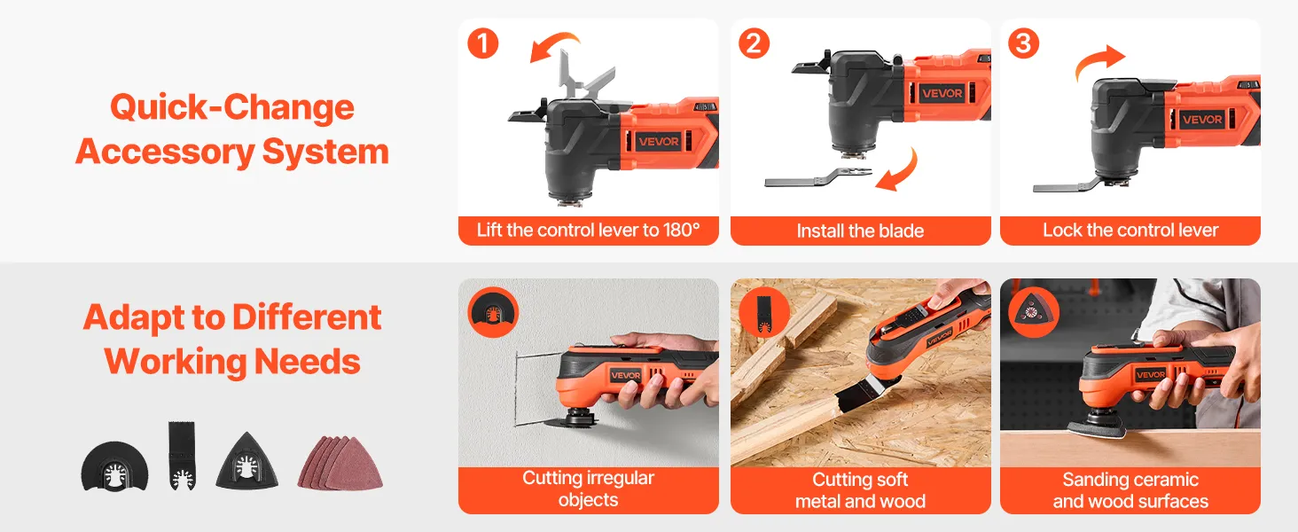 6 Variable Speeds: This multitool oscillating tool features a 3.2° oscillation angle and 6-speed settings (6000 to 17,500 OPM) for different tasks. Use levels 1–3 for fine sanding, and levels 4–6 for fast, high-efficiency cutting
