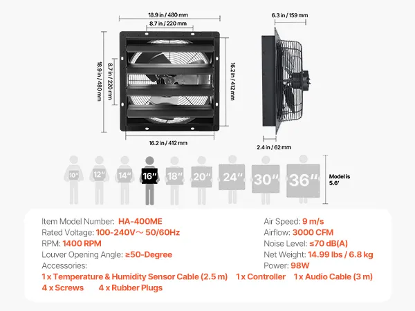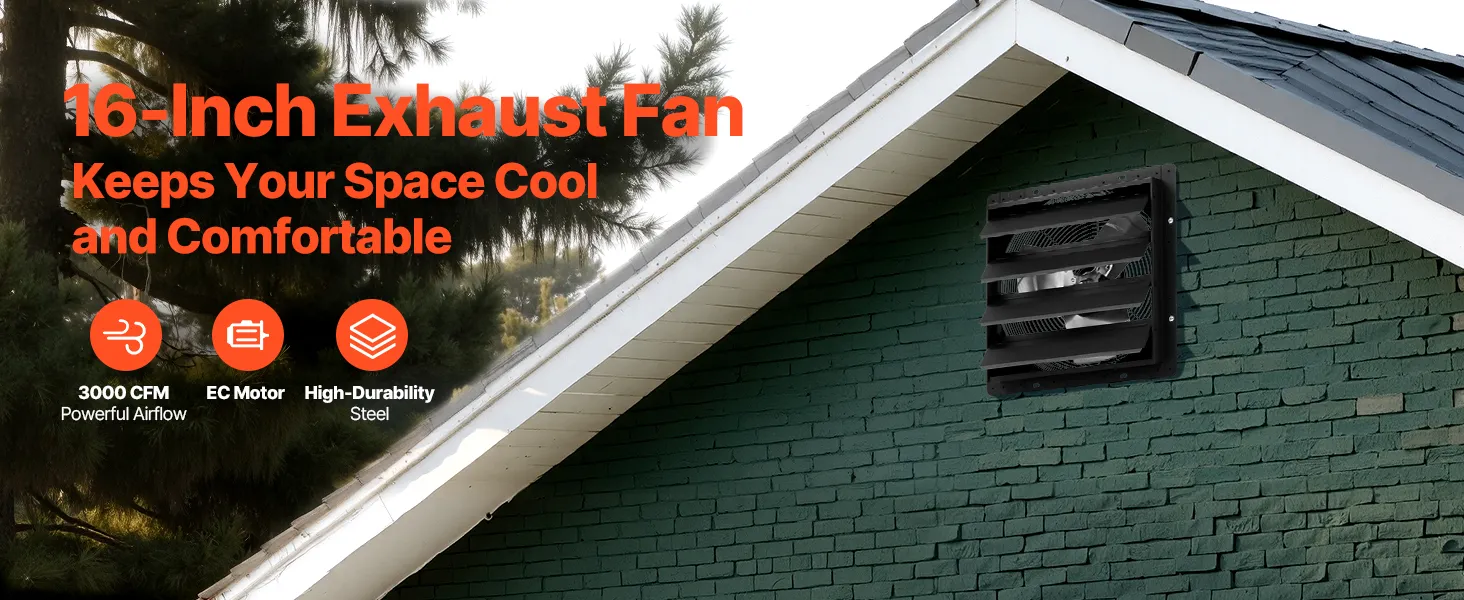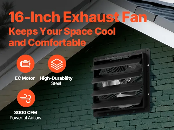 VEVOR 16 inch Shutter Exhaust Fan, Wall Mounted Attic Vent Fan with Smart Programming Variable Speed Temperature Control, 2900 CFM,EC Motor,Timer, for Shed,Garage,Greenhouse Ventilation Cooling,Black
