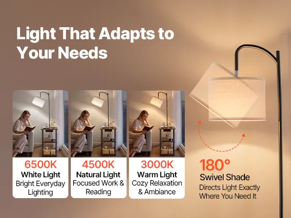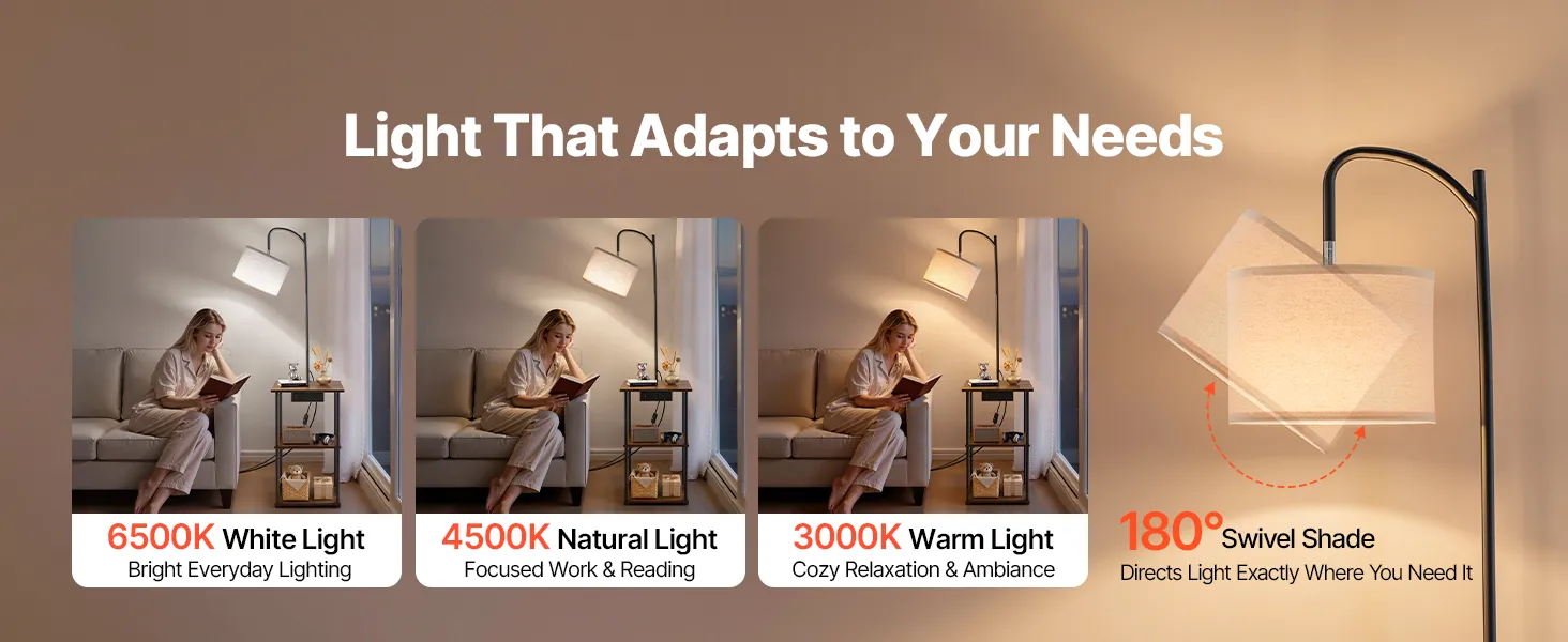 Our end table with lamp provides 3 color temperatures (3000K/4500K/6500K) to suit reading, working, or relaxing. The 180° rotatable shade directs light precisely where you need it and helps reduce glare.