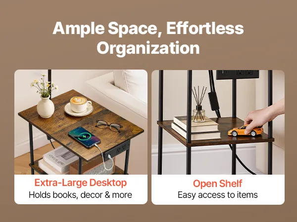 This side table with lamp features a three-tier open storage design, and its wide tabletop supports up to 66 lbs/30 kg, giving you plenty of space for books, décor, and everyday items.