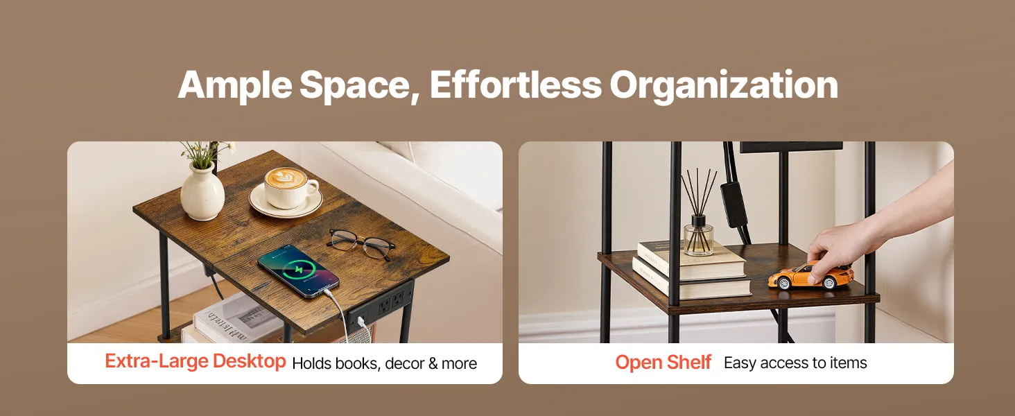 Spacious Storage: With an open two-tier design, each shelf holds up to 22 lbs/10 kg for books, glasses, snacks, or tissues. The wide tabletop supports up to 66 lbs/30 kg, making this metal end table perfect for phones, tablets, blankets, décor