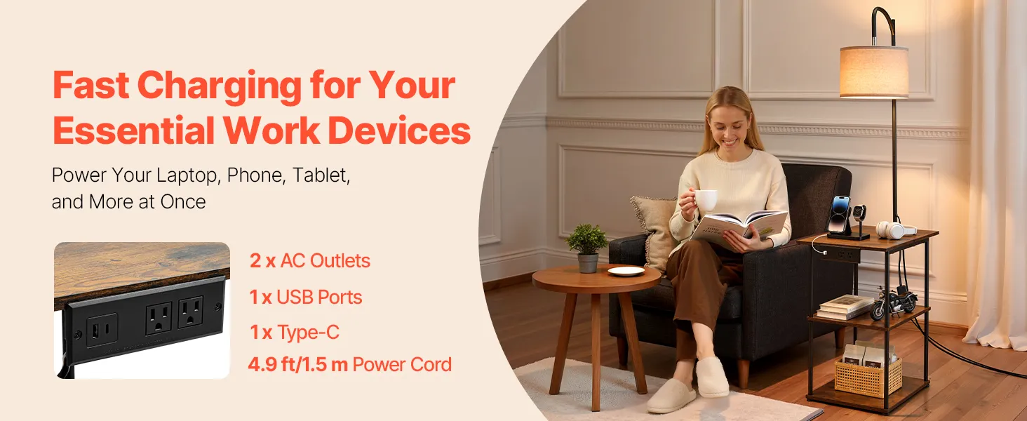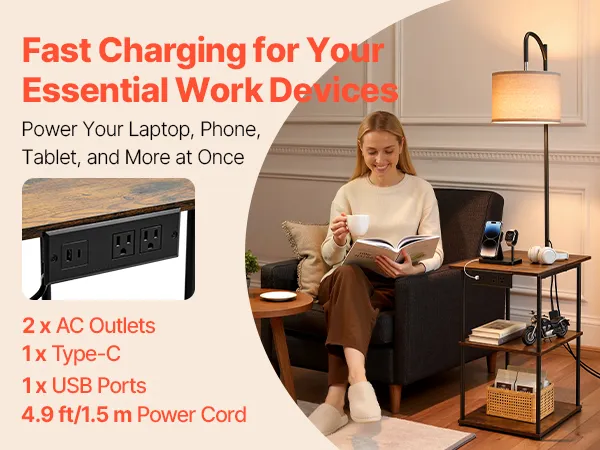 Convenient Charging: Equipped with 1 USB port, 1 Type-C port, 2 AC outlets, and a 4.9 ft/1.5 m power cord, our lamp with table can charge laptops, phones, and more simultaneously, providing great convenience for work, study, or daily use