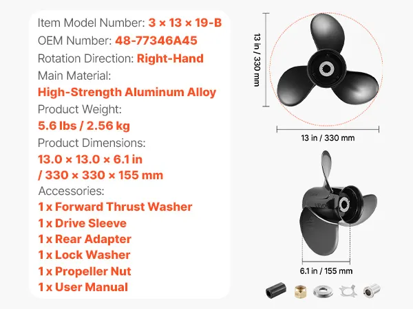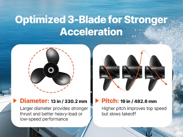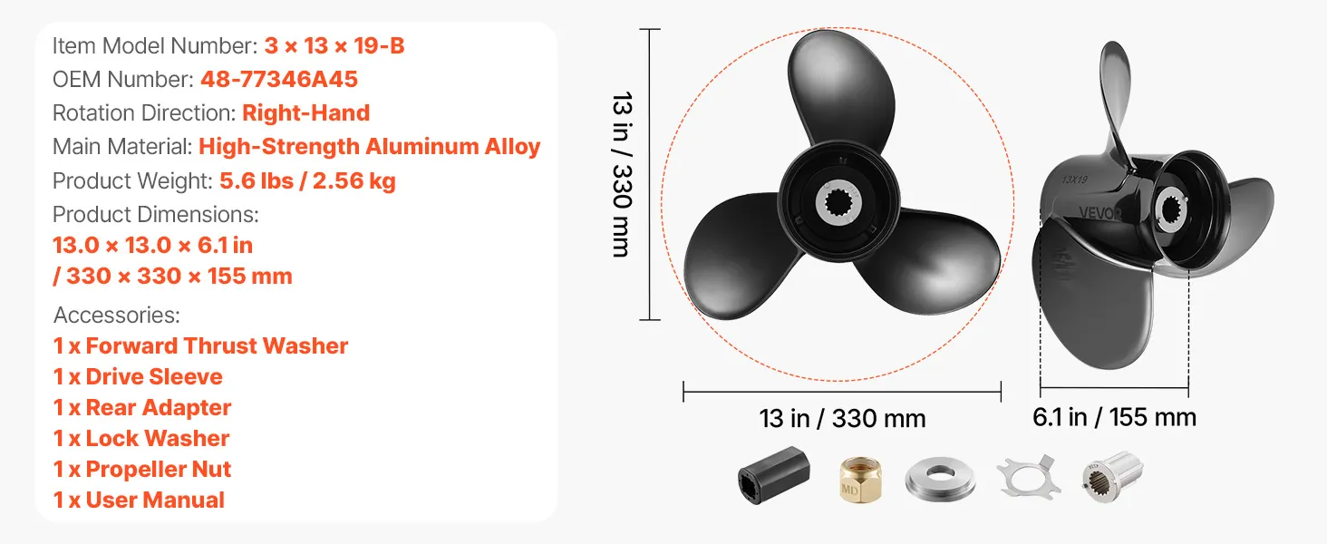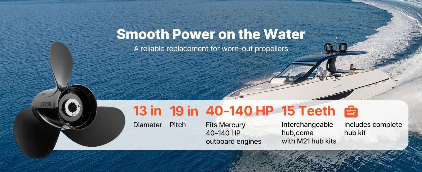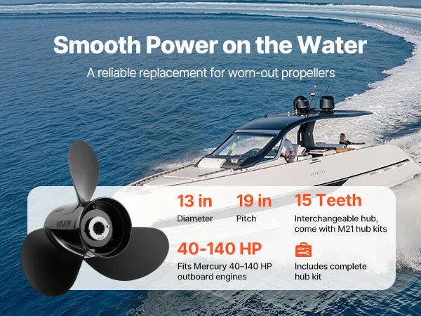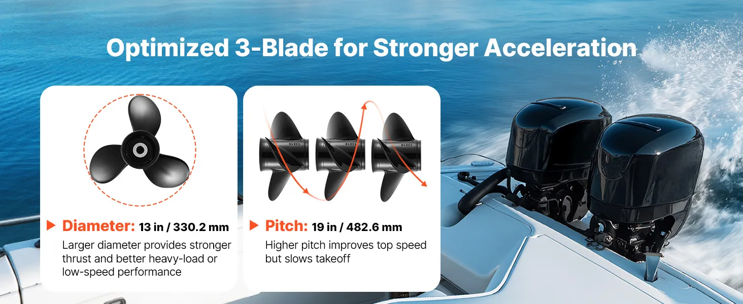 Powerful Thrust: With a 13 in diameter and 19 in pitch, this outboard boat propeller delivers responsive acceleration and steady power delivery. Suitable for fishing, cruising, and leisure boats, it is versatile, improving fuel economy