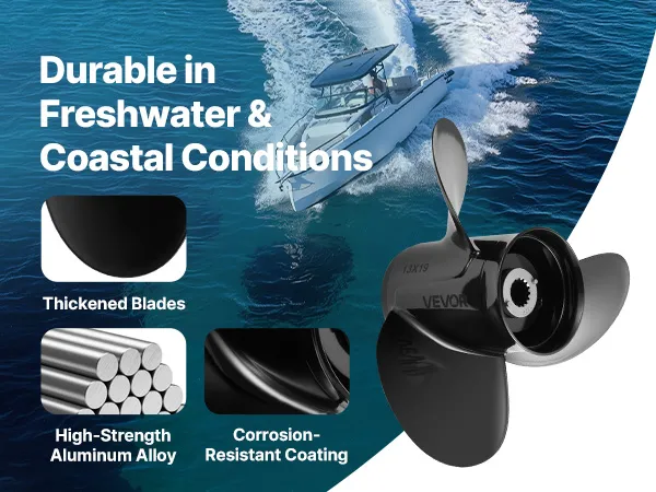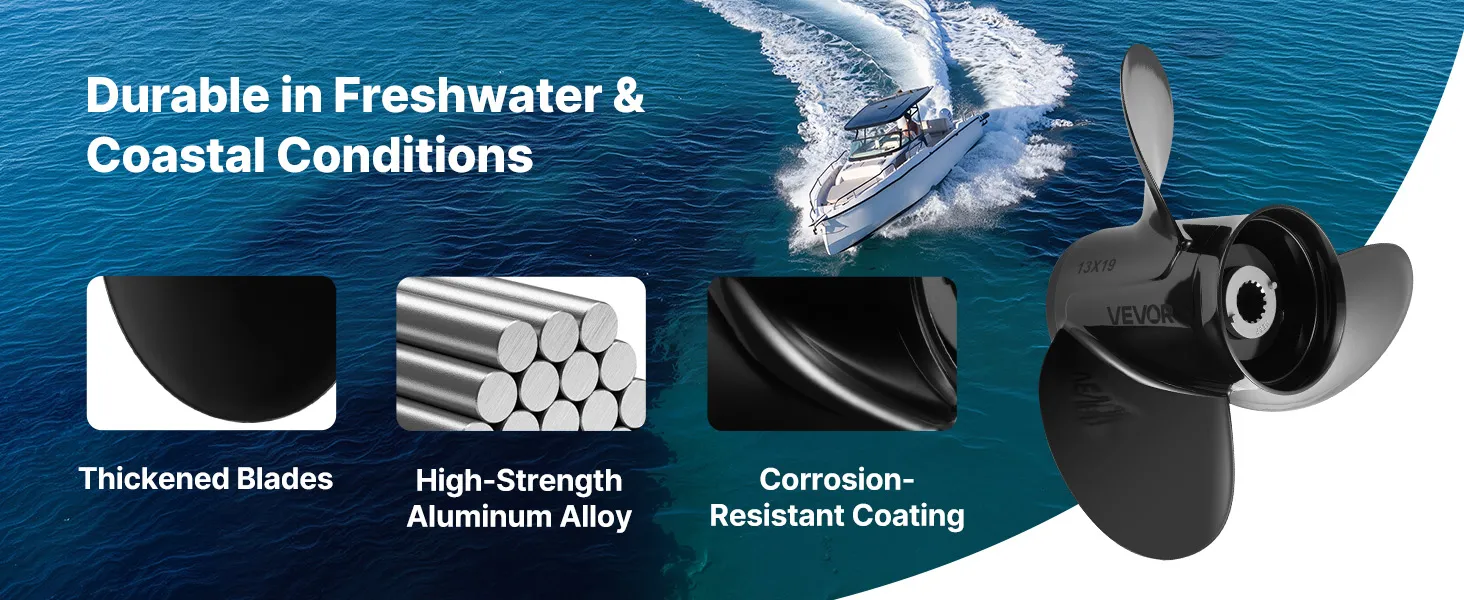 Sturdy & Durable: Made from corrosion-resistant aluminum alloy, this boat propeller is suitable for extended use in both freshwater and saltwater conditions. It also remains lightweight to improve rotational efficiency