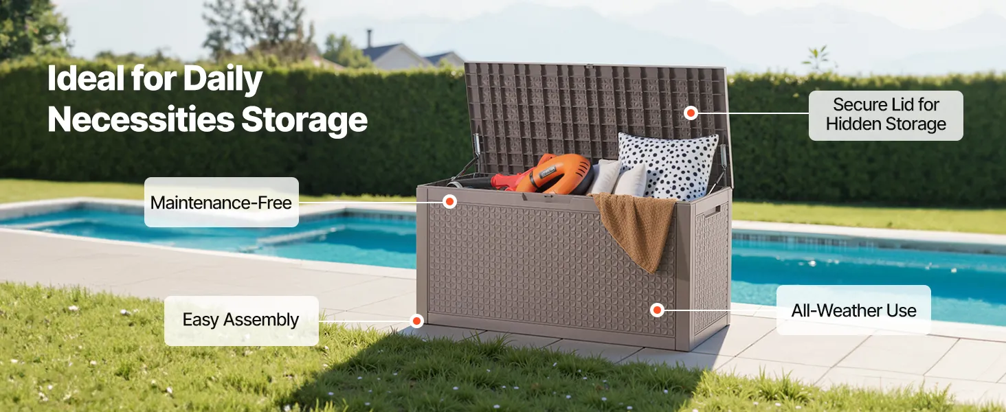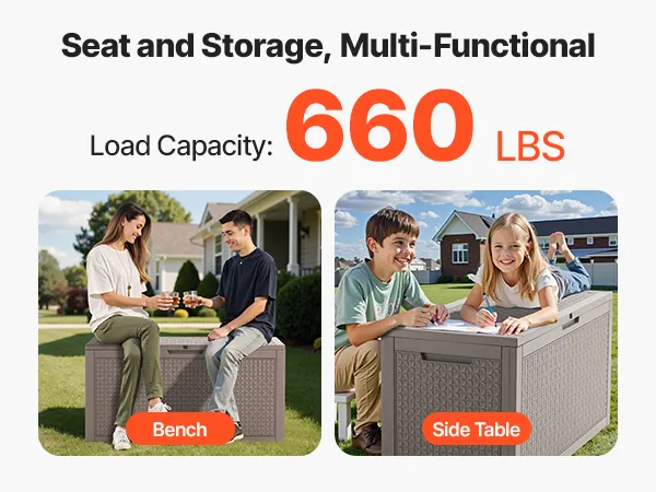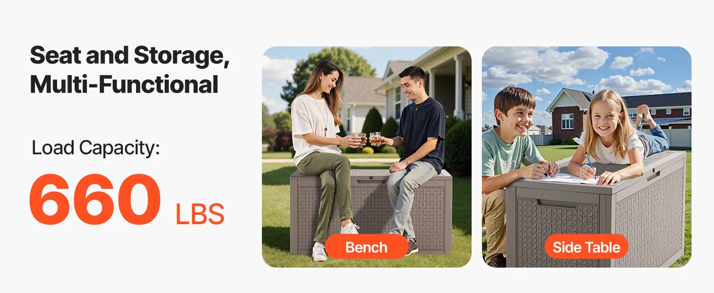 Bench and Table Use: Our outdoor deck box has a flat top that doubles as a sturdy bench or table. It supports up to 660 lbs, strong enough for two adults to sit comfortably