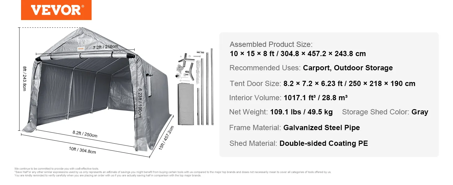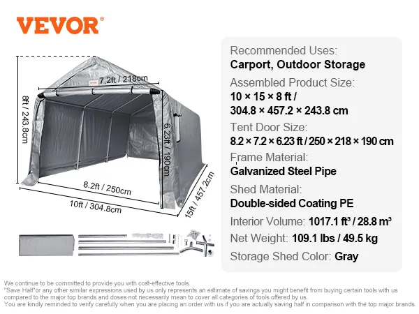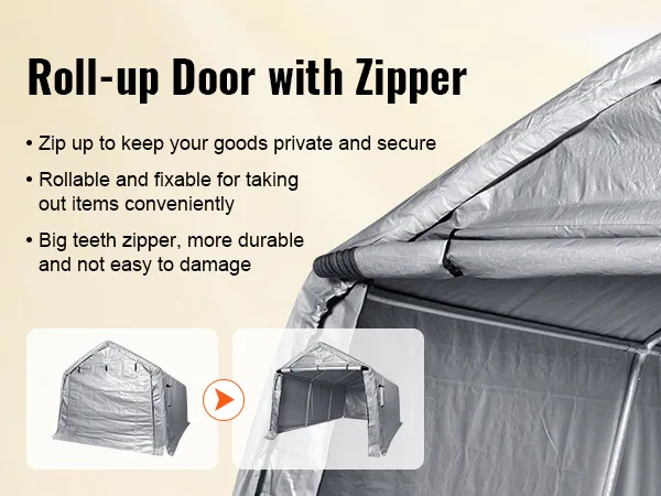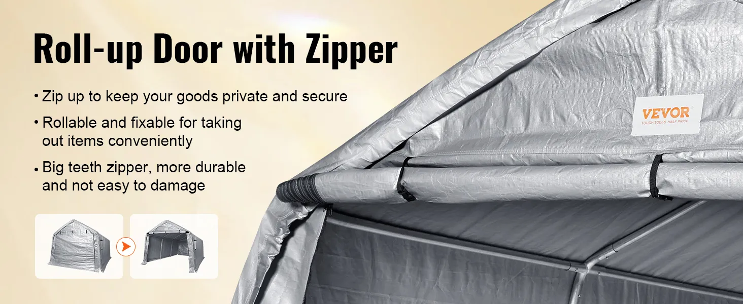 The VEVOR outdoor portable storage shelter has a spacious design. Its 10x15x8-foot size provides ample storage space. The roll-up zipper door makes it easy to access your items. You can quickly open and close the door without any trouble. The shelter’s spacious interior allows for easy organization.