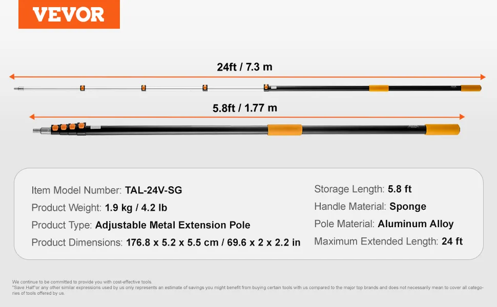 An extension pole that can efficiently and conveniently complete aerial work, 6~24ft can be freely adjusted to the ideal length, equipped with universal threaded interface, can be used with a variety of accessories to realize multi-purpose pole.