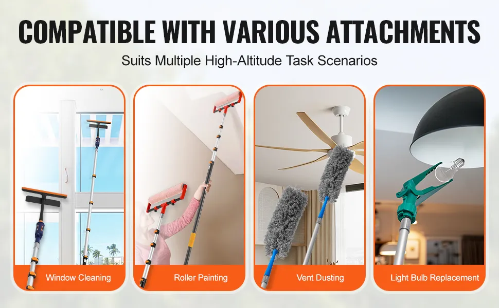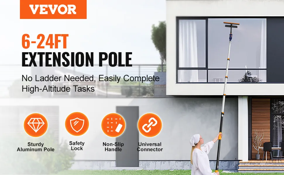 Flexible Length Adjustment: Extends from 6 to 24 feet to meet various high-reach needs, making the extendable pole easy to clean tough-to-reach spots while reducing ladder use for safer, more convenient elevated tasks.