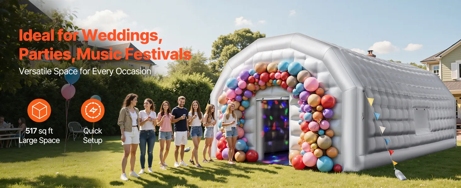 This 517 sq ft inflatable nightclub tent offer large space for weddings, birthdays, Halloween, and epic parties. It sets up and packs down fast, features disco lighting compatibility, durable Oxford fabric, and reinforced stability, making it your reliable partner for every celebration.