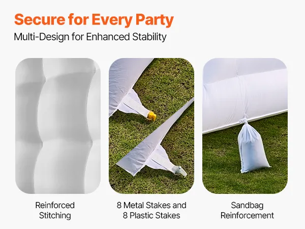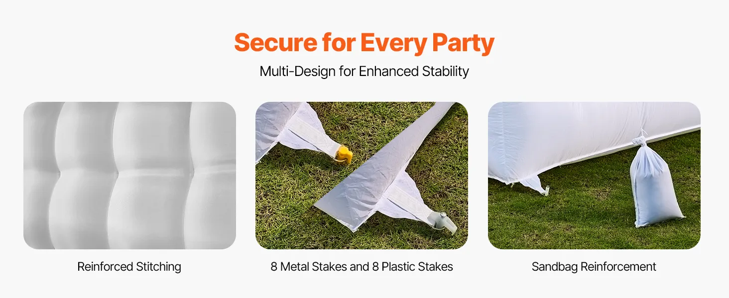 Stable Setup: The blow up party tent with reinforced stitching, multiple stake points, and weighted sandbags keep the tent secure on any outdoor surface.