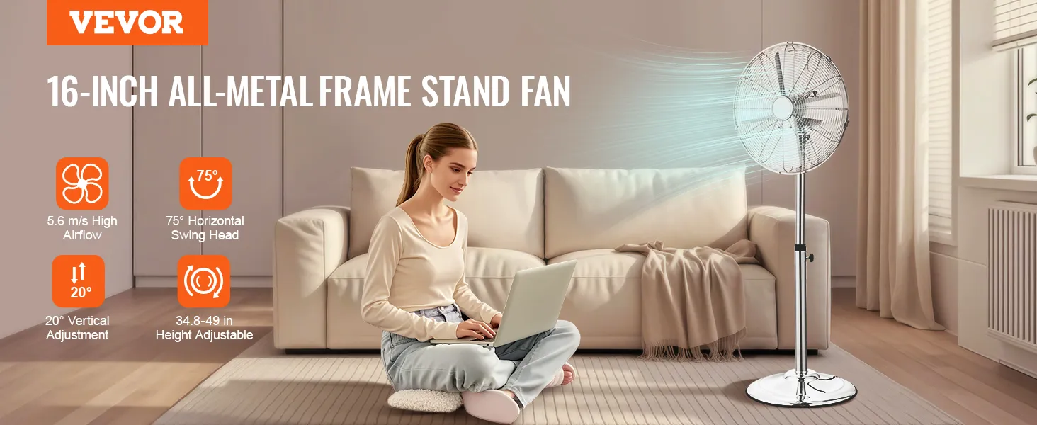 VEVOR Industrial Pedestal Fan, 16 Inch Oscillating Standing Fan, Adjustable Height Floor Stand Floor fan with 3 Adjustable Speeds, High Power Tall Fan for Bedroom, Living Room, Home Office