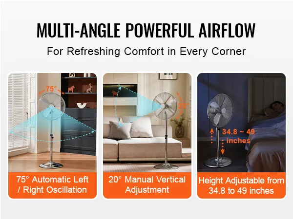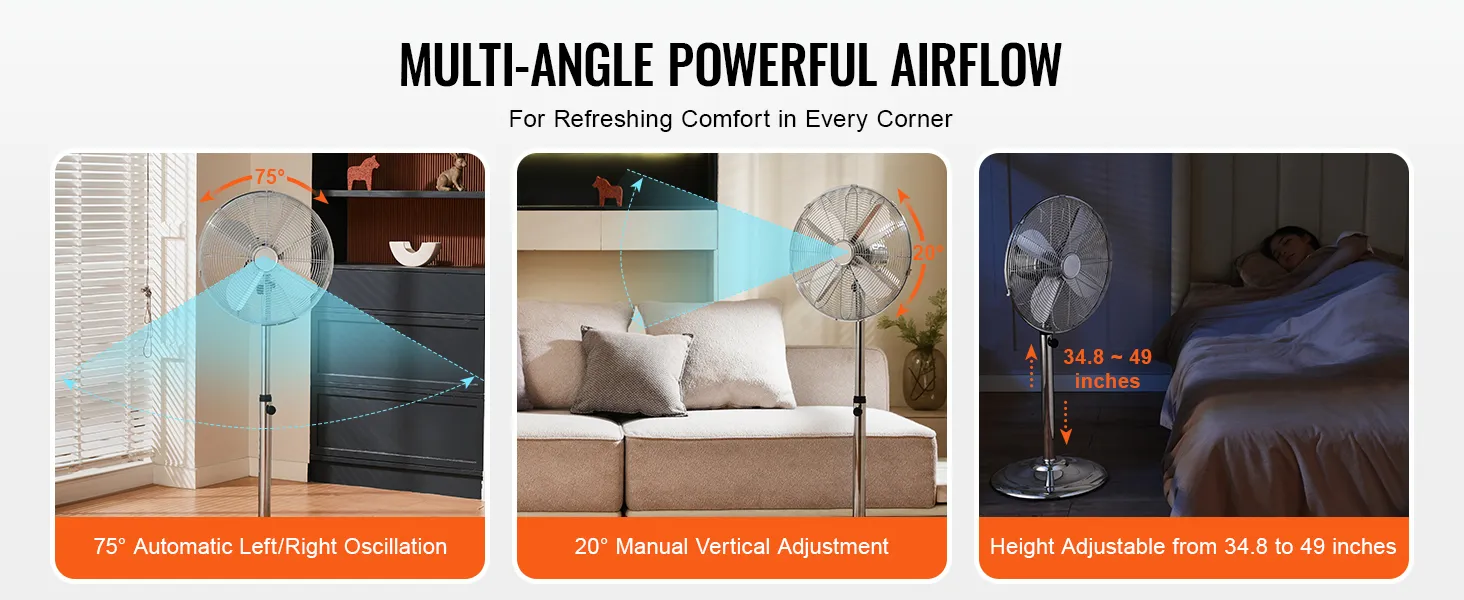 14.76ft Airflow Distance: Designed with a 20° manual vertical adjustment and a 75° wide-angle automatic oscillation, this floor fan cools every corner of your space, regardless of where you are.