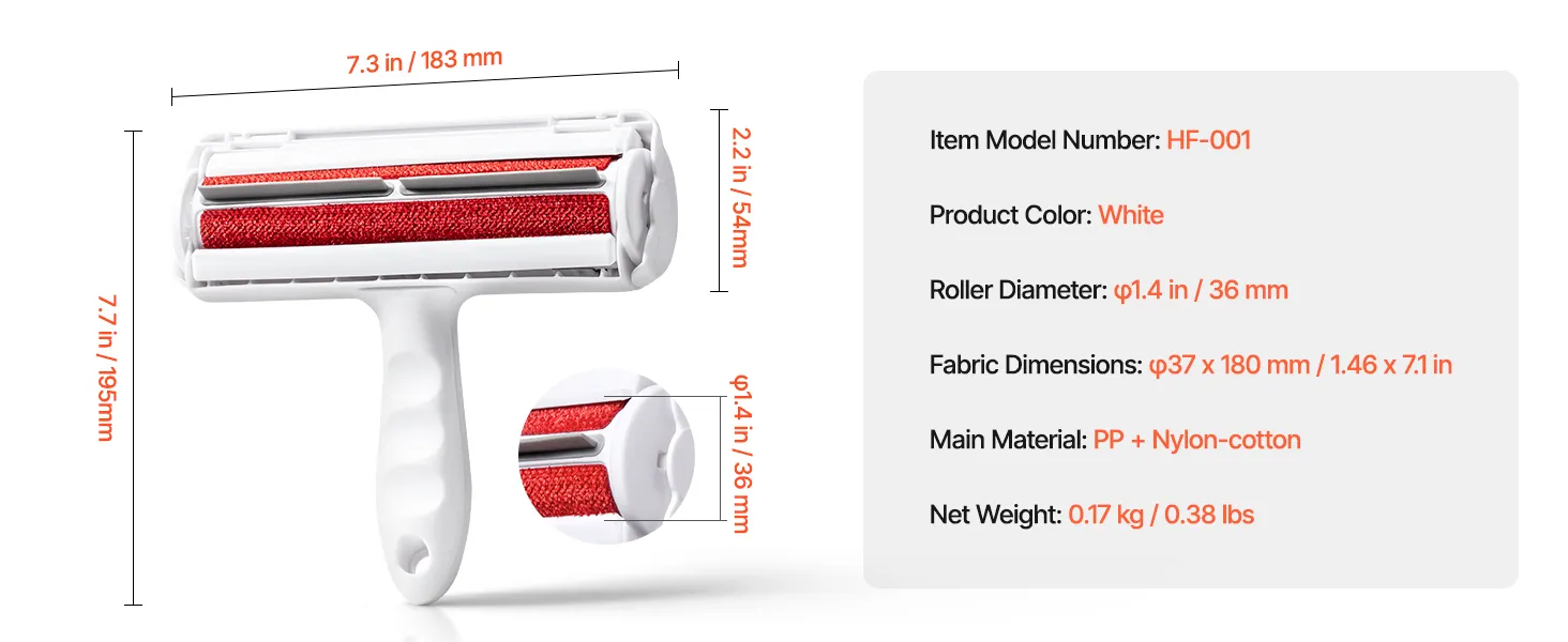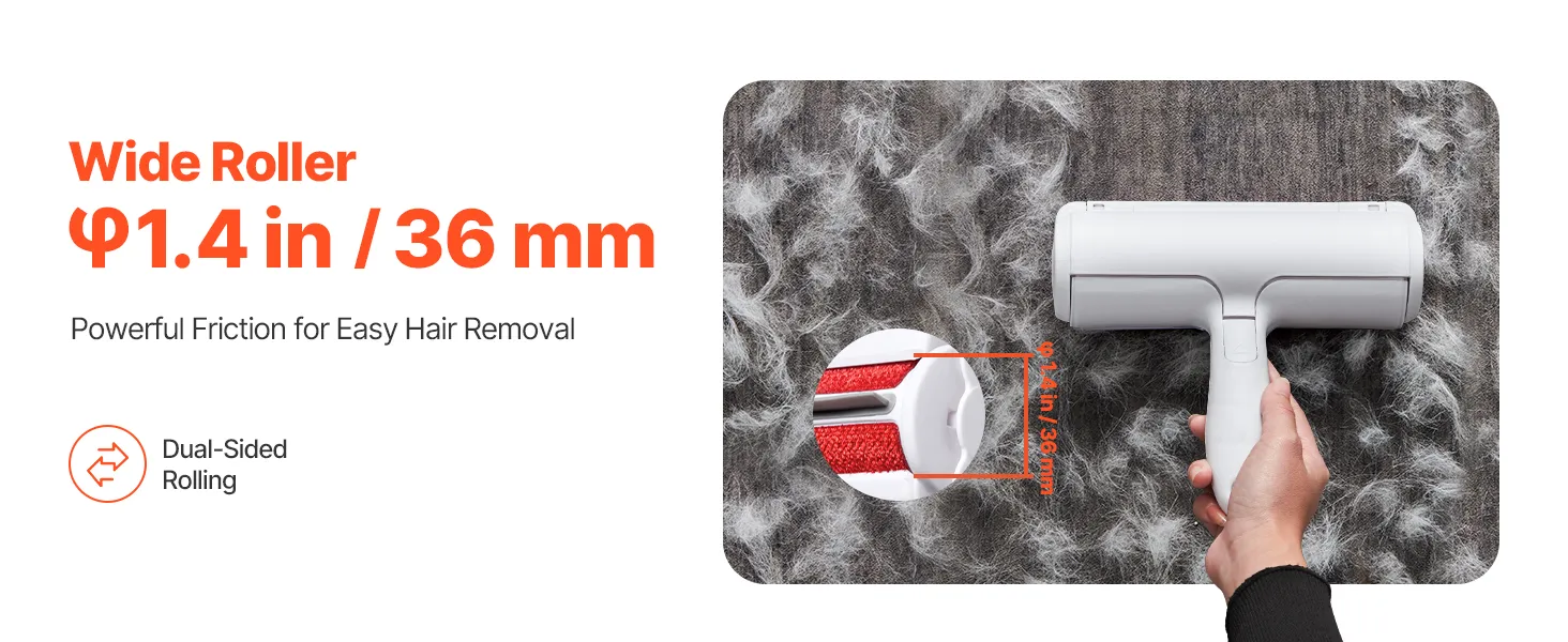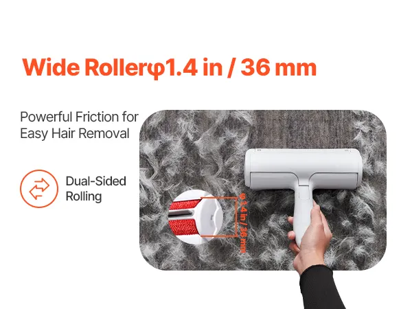 Powerful Dual-sided Hair Removal: This pet hair roller remover features a φ1.4 in / 36 mm wide roller that rolls both ways, using strong friction to effortlessly pick up pet hair.