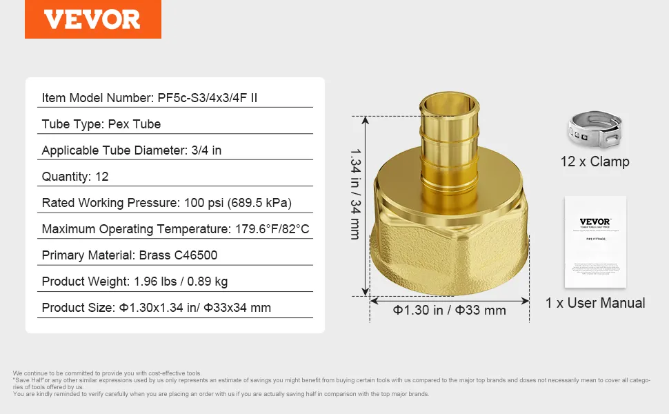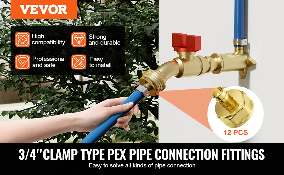 Professional Safety: This set of pipe fittings includes 12 clamp-style female threaded connectors and 12 clamps, all meeting the same standards for commercial and residential plumbing applications. Each fitting can withstand pressures of up to 100 PSI and temperatures of 82°C/179.6°F.