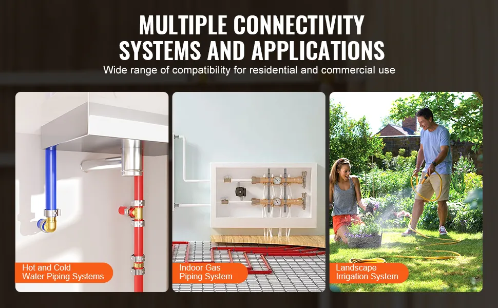 High Compatibility: Pipe fittings are suitable for PEX and PP plastic pipes, primarily used for connecting pipes in various applications such as water heaters, air conditioning systems, plumbing systems, hydronic heating systems, electrical conduits, and hot and cold water distribution in RVs, providing an excellent solution for pipe-to-pipe or pipe-to-fitting connections.
