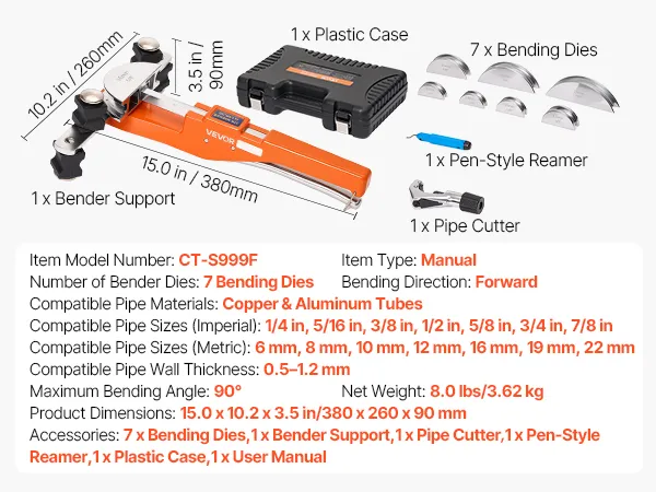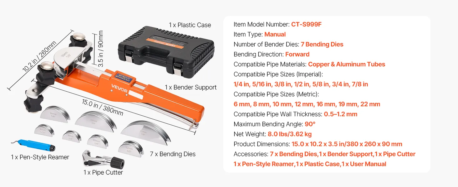 This manual ratcheting tube pipe bender tool comes with 7 dies, supporting precise bending of copper and aluminum tubes from 1/4 inch to 7/8 inch (6 to 22 mm). With a 0° to 90° bending angle, it is ideal for HVAC installation, auto repair, and DIY use. Compact build makes it easy to carry and store.