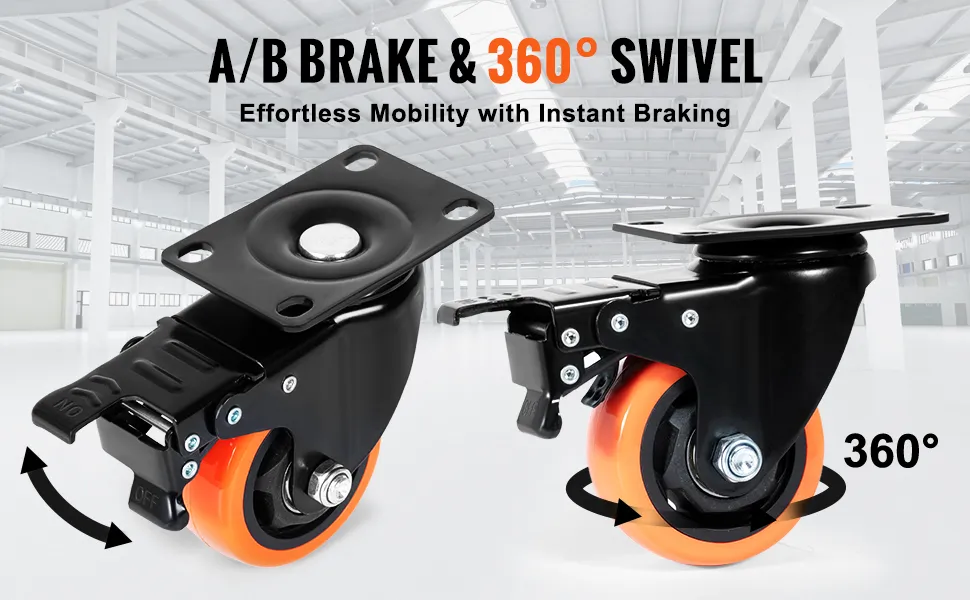 The 3-inch swivel casters have noise-free PVC wheels. They provide a smooth rolling experience. This is beneficial for both home and commercial use. The wheels glide easily across various floor types. These include concrete, wood, and tile. Their smooth operation reduces the effort needed to move heavy loads. The noise-free design ensures quiet operation. It's especially useful in environments where noise needs to be minimized. Also, the PVC wheels are non-marking, so they keep your floors clean and scratch-less.