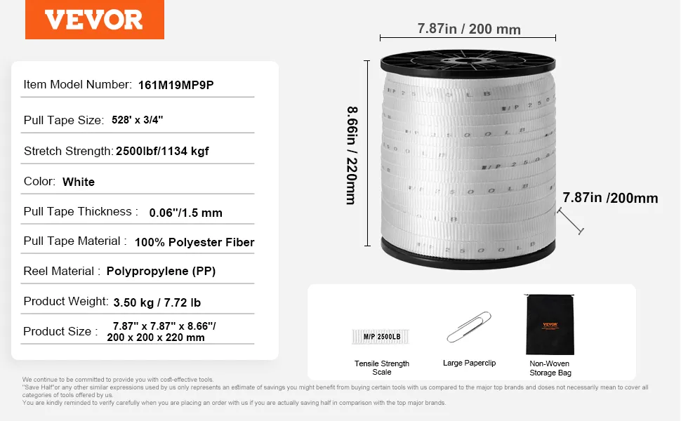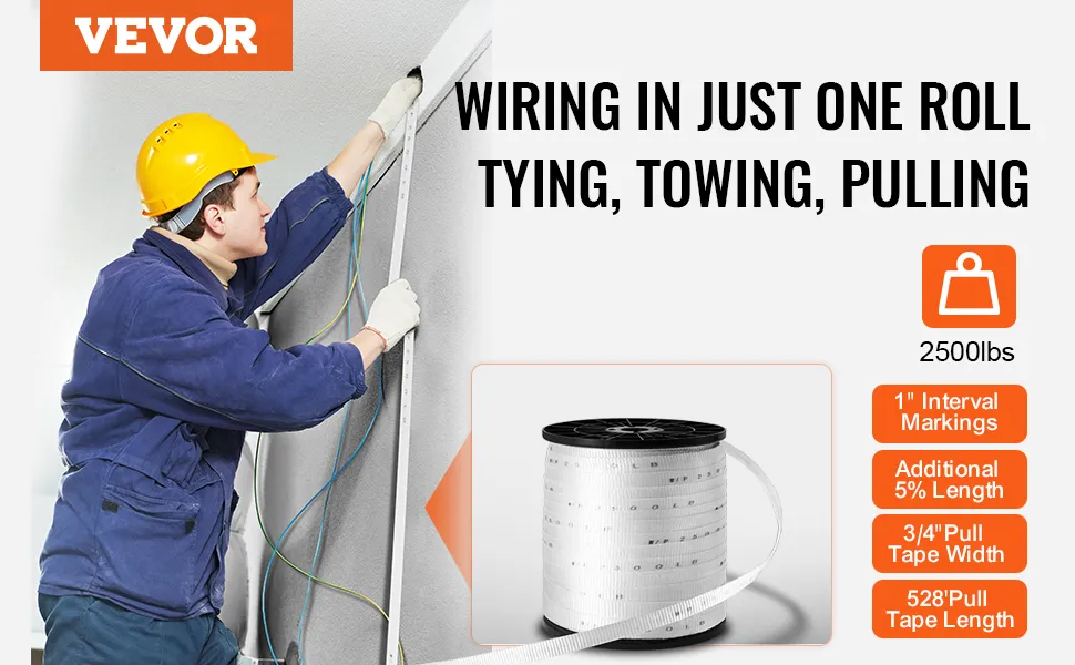 The VEVOR polyester pull tape has a high tensile strength of 2500 lbf. It’s perfect for tough jobs that require strong pulling power. Made from high-quality 100% polyester material, this cable pulling tape ensures durability and reliability in various applications. Every inch features strength markings for added security. You can use the tape for heavy-duty tasks like pulling goods and tightening gear. High strength and low stretch properties allow it to handle tight spaces. This makes it ideal for electrical conduit work as well. Its robust construction ensures it holds up heavy loads without tearing. Whether for professional or DIY projects, this tape can handle the job. Anyone needing reliable pulling power should have this tool.