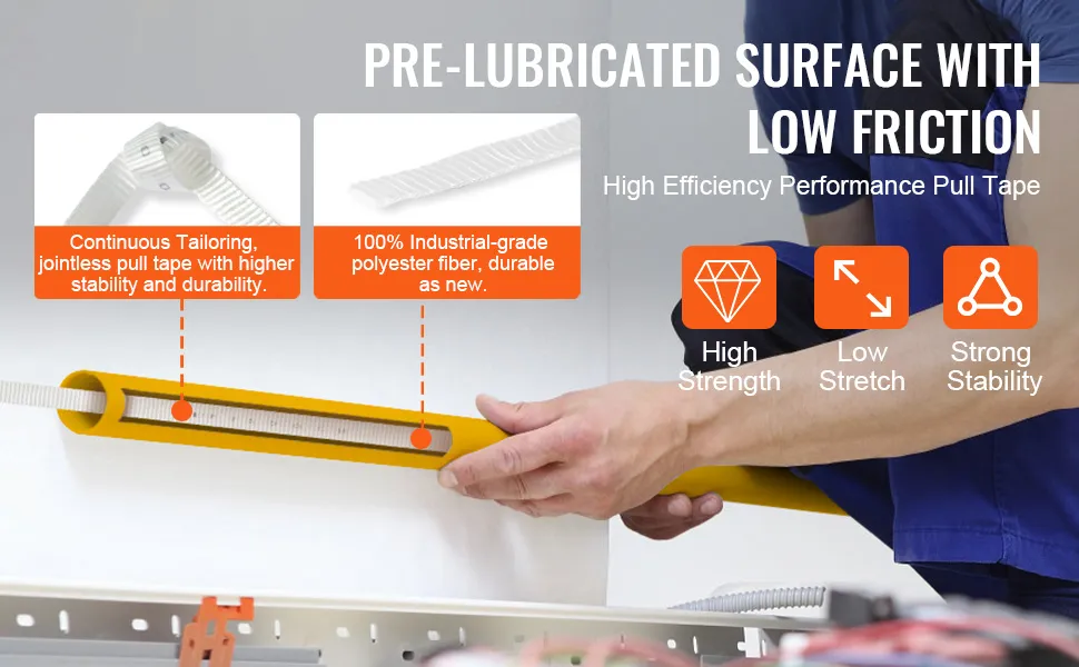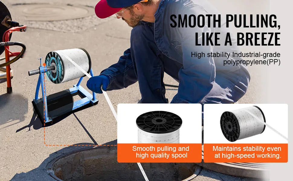 The VEVOR polyester pull tape has a smooth surface design. This reduces friction during use, making it easy to handle. The tape glides smoothly through tight spaces and conduits. Pre-lubricated surface ensures it works efficiently. You won't have to worry about it becoming stuck or creating resistance. The smooth surface also makes cleaning and maintenance easier. It ensures that the tape stays in good condition for long-term use. Design makes it user-friendly and convenient for any task. Whether pulling wires or secure goods, this tape works smoothly and efficiently.