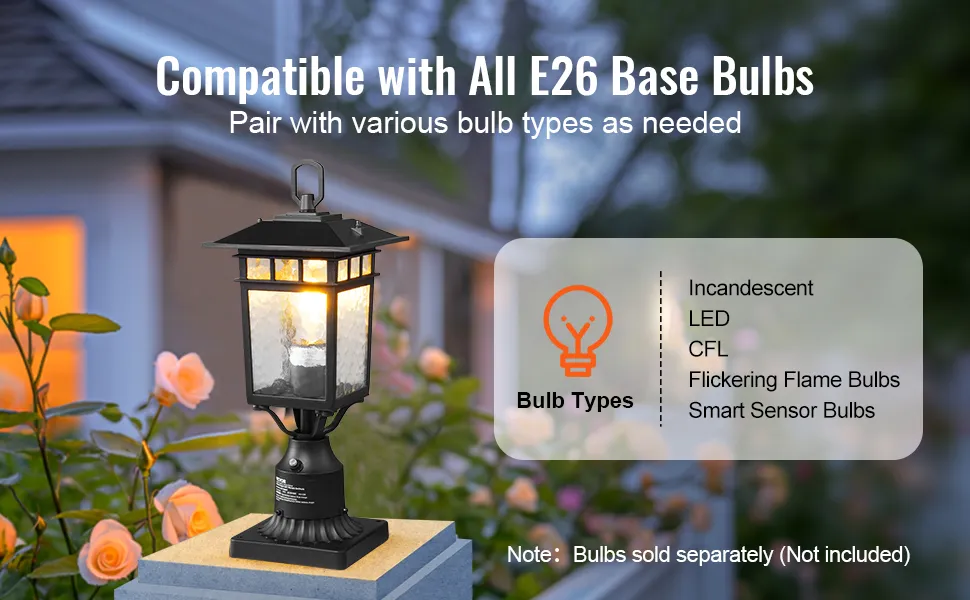 You can change the style and brightness of your lights. The outdoor garden lighting can use E26 bulbs like LED, CFL, and incandescent bulbs. You can save money by using energy-efficient bulbs. The fixture is compatible with smart bulbs, which makes it easier to use. Its flexible design works with a lot of different styles of decor. You can enhance your outdoor garden by adding customizable lights. You can change the color and brightness of the light to fit your room. Changing the bulb is a quick and easy process. This adaptability allows you to create a room that feels warm and inviting or bright and open, as desired. Get a stable lighting solution that can be easily adjusted to fit your needs, enhancing your outdoor spaces.