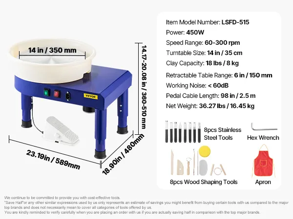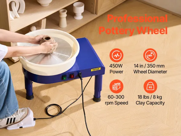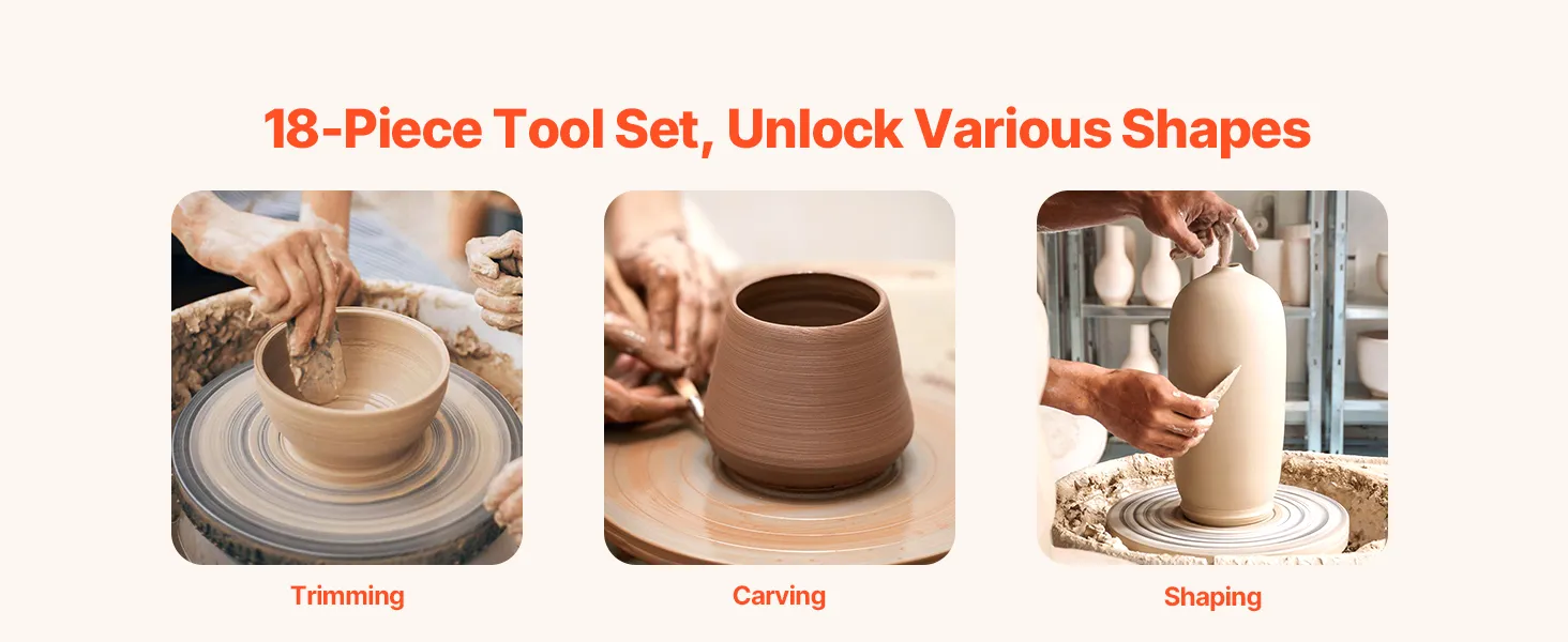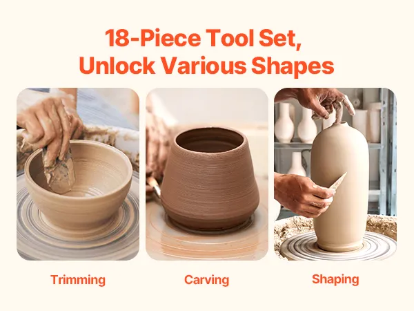 Complete Sculpting Tools Included: 8pcs stainless steel tools and 8pcs wood tools are provided with this pottery wheel to help you create your dishware, vases, and ceramic art pieces effortlessly. Suitable for school teaching, pottery bar, home use, etc. Supports the throwing and shaping process that meets the demands of the most professional ceramic craftsmen and amateur enthusiasts