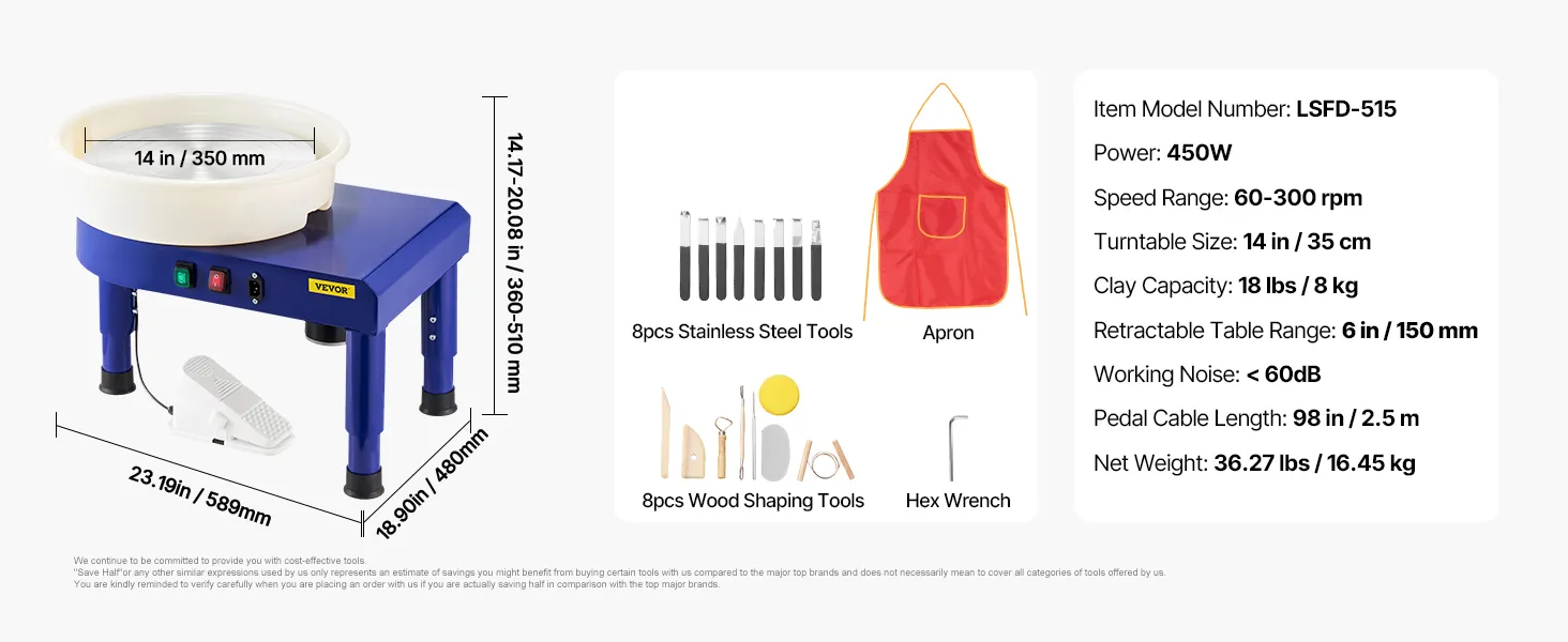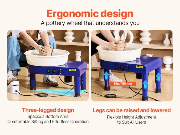 Our electric pottery wheel comes with a set of 8 stainless steel tools, an 8-piece wooden tool set, a waterproof apron to keep your clothes clean, and a hex wrench. Enjoy endless possibilities for carving and shaping with ease.