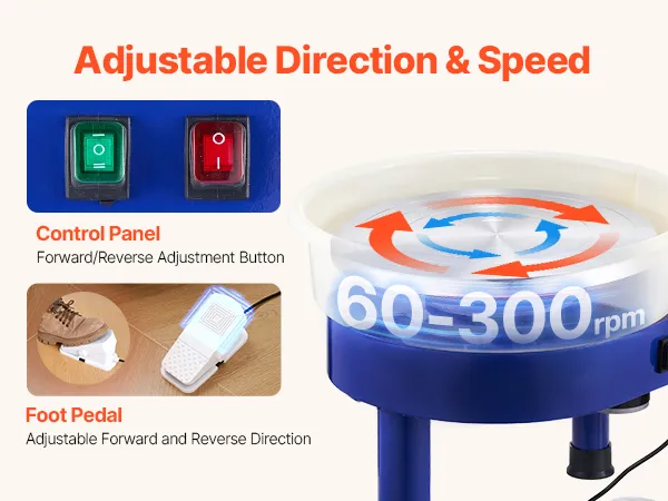 The potters wheel provides two control modes: use the buttons to adjust rotation direction to suit different needs. While crafting, the foot pedal allows for hands-free control over direction and speed, letting you focus entirely on your creation.