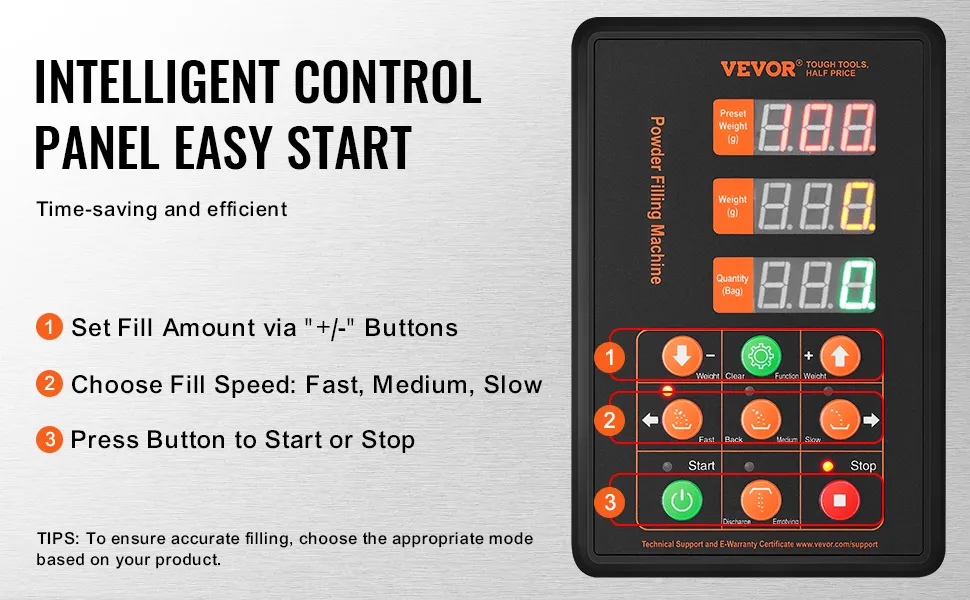 The smart control panel is easy to set up. It allows for simple changes in weight and speed. This flexibility makes it versatile for different materials. No matter if you need slow filling or fast filling, it’s easy to set. We designed the panel for quick and simple operation, ensuring consistent performance with every use. The intelligent control feature improves the machine's usability by catering to individuals seeking flexible filler solutions. With the VEVOR automatic particle weighing machine, you can achieve precise control effortlessly.