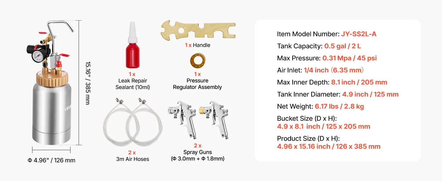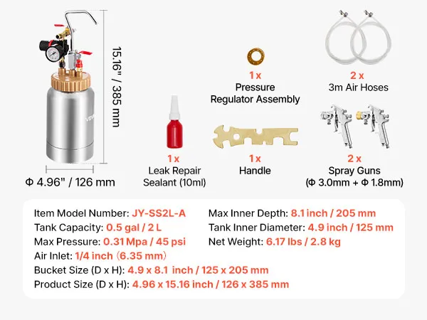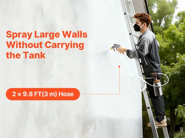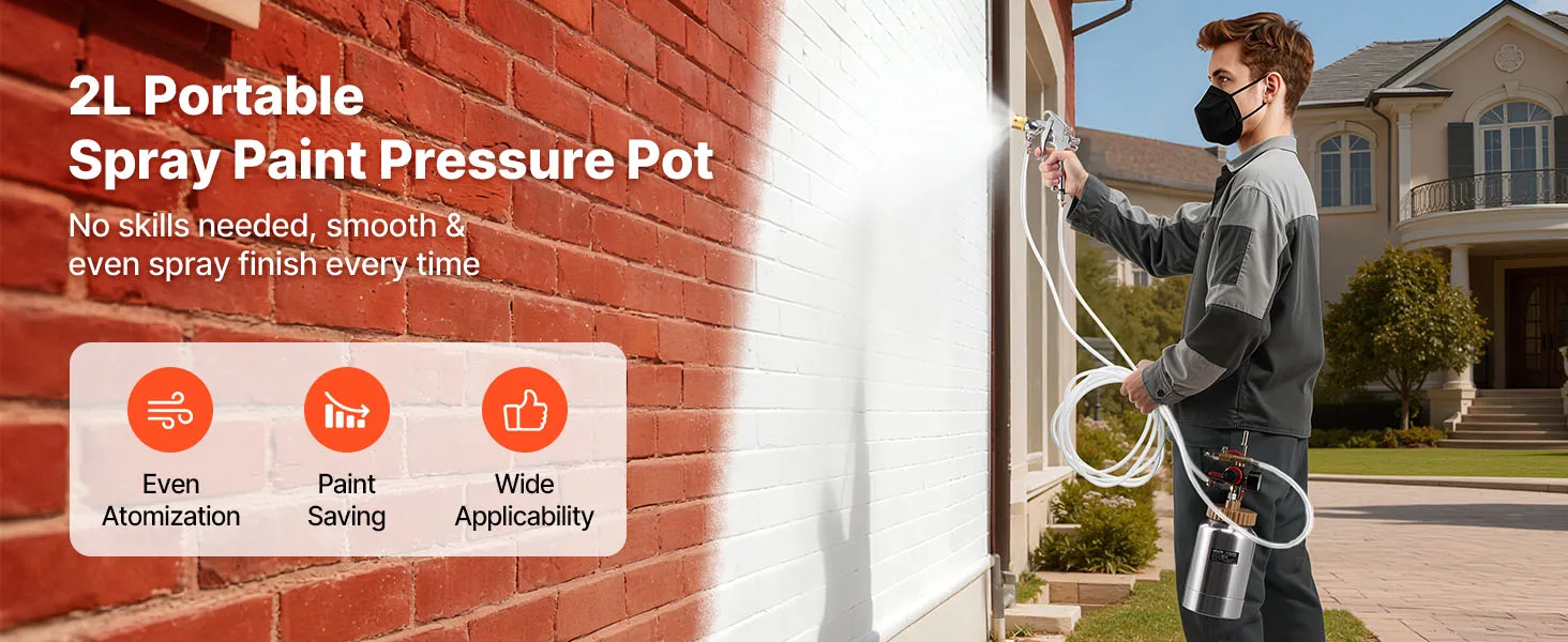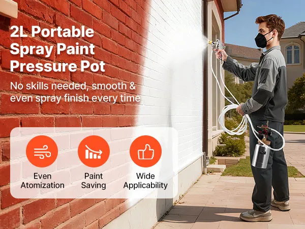 Featuring a 2L aluminum pressure tank and two adjustable spray guns (1.8mm & 3.0mm), our spray paint pressure pot delivers smooth coating control. Its lightweight design reduces hand fatigue, while the full exterior cover structure supports steady spraying on furniture, walls, fences, and more.