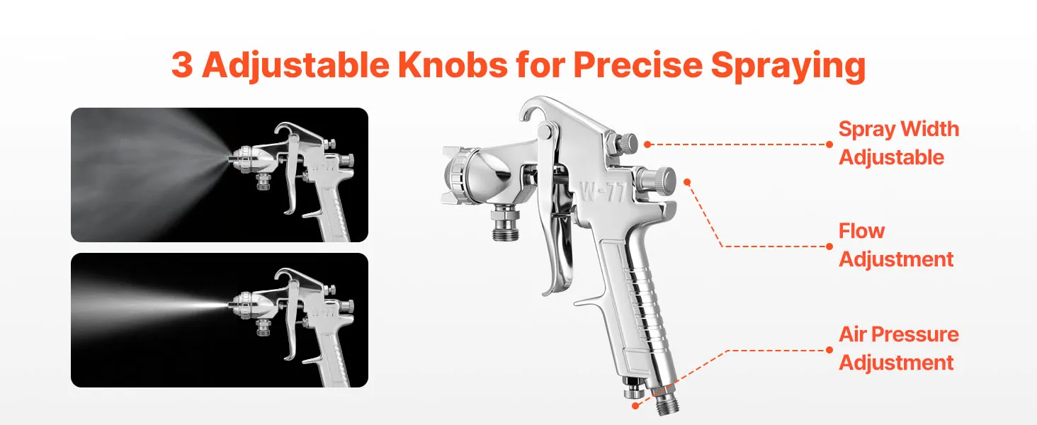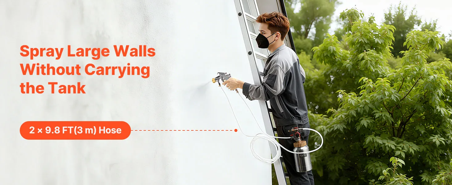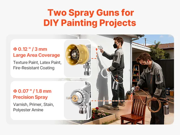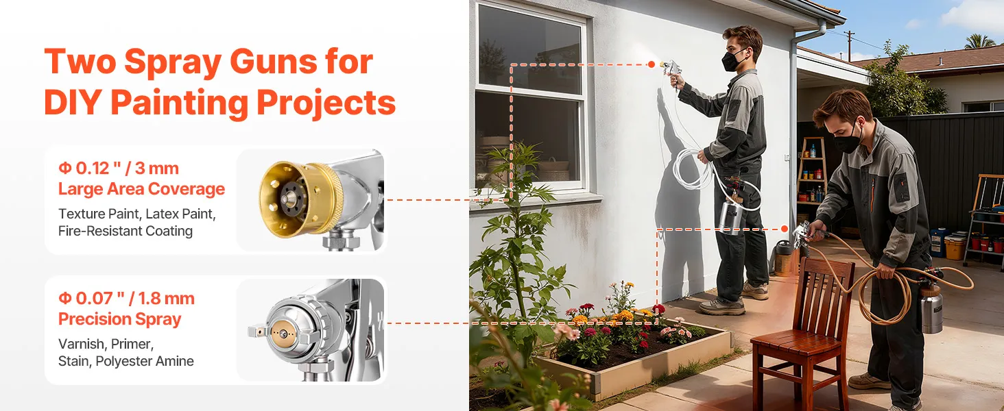 Wide Application: The 1.8mm gun handles primers, clear coats, stains, and polyamide finishes, while the 3.0mm gun works with texture coatings, fire-retardant paints, and latex. Ideal for furniture restoration, wall repairs, wooden fences, and automotive spraying when used with VEVOR paint pot