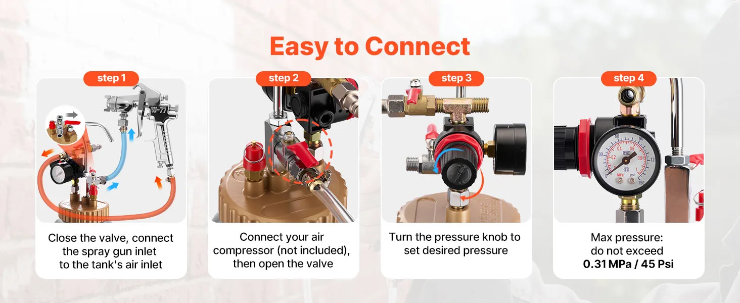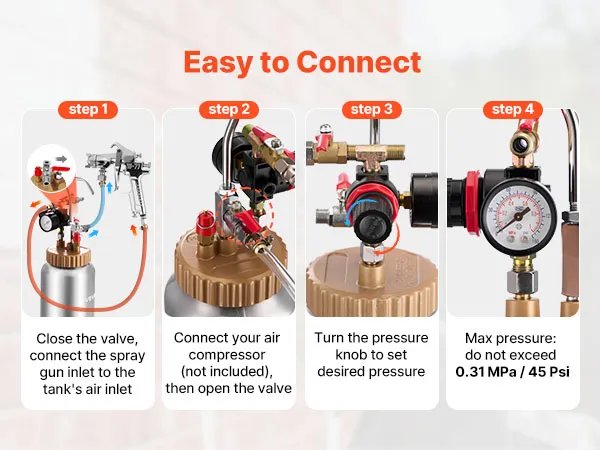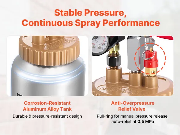 Stable Pressure Tank: The aluminum alloy pressure tank is durable and explosion-resistant. Its tightly connected sealed lid maintains pressure during extended use, and extra sealing glue enhances connections—allowing the spray paint pressure pot to deliver continuous, reliable spraying