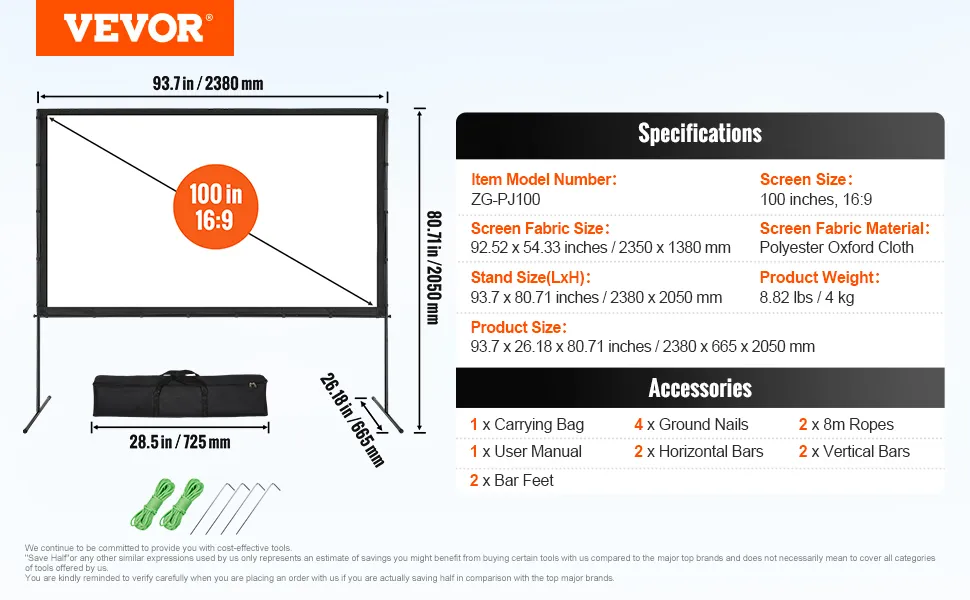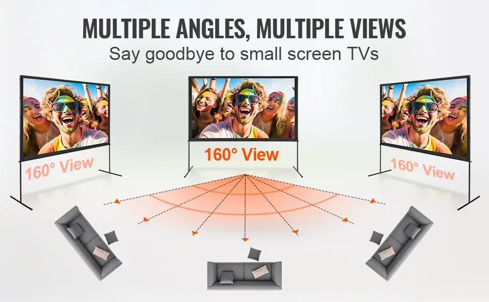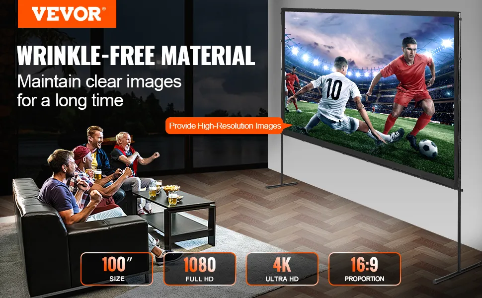 High-quality polyester oxford cloth constructs the VEVOR projector screen. This material enhances the viewing experience by providing a bright, clear surface for projection. The design of the screen effectively reflects light, resulting in vibrant and clear colors. The material is also durable and easy to clean, ensuring that the screen stays in good condition for ages. Therefore, it's a great investment for anyone who loves hosting movie nights and other events.